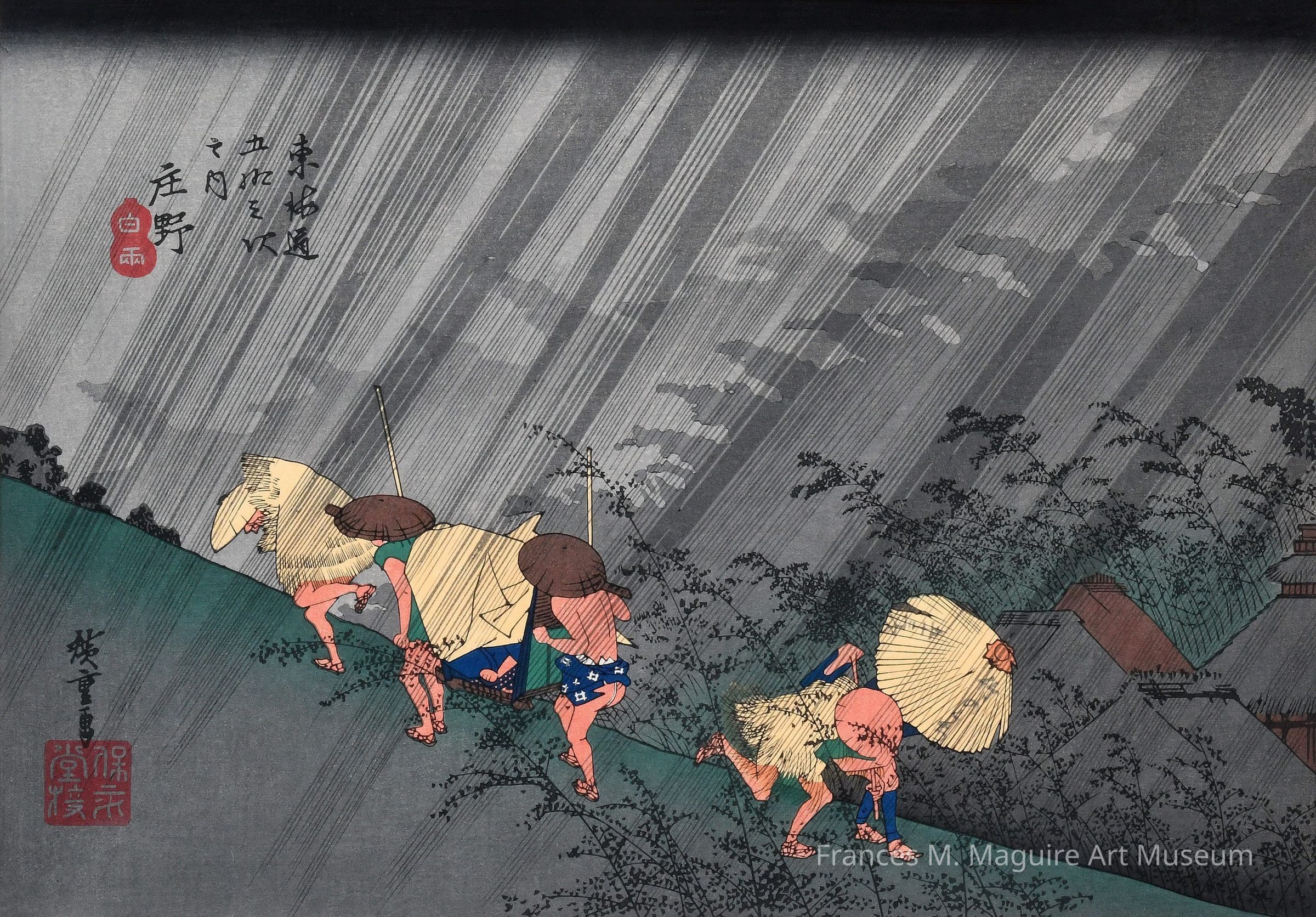 Hiroshige’s works often convey the active class divide in Japan, as well as the fragility of life as a function of nature. Here he shows that there is always the potential for a typical journey to turn into chaos at the snap of a finger. In this scene of a tumultuous rainstorm on a mountainside in the town of Shōno, the passenger in the palanquin is protected from the rainfall, while the other five individuals must endure the weather conditions with only straw hats and capes, and a sole umbrella. Label Type