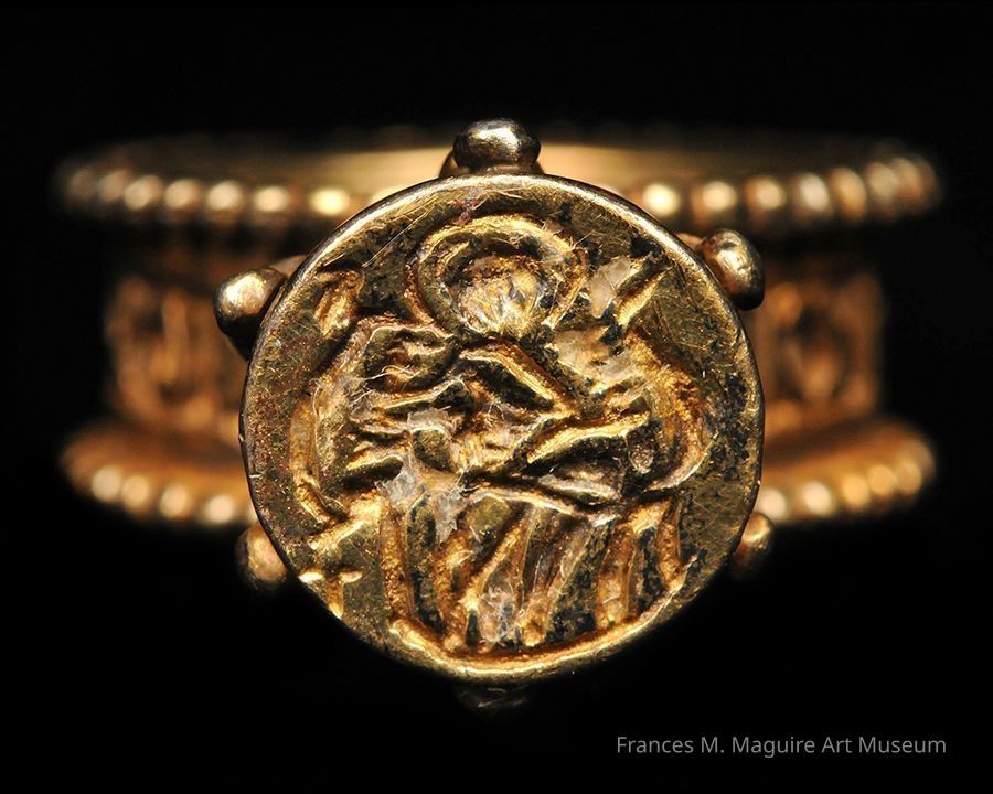 An image of the Tyche of Constantinople (the female personification of luck in ancient Greek city cults) is engraved upon the bezel (face of the ring). The seated image of the Tyche is similar enough in style to images of the seated Virgin Mary that the two images may have been conflated in the arts of this region. An inscription in Greek around the band appeals for help for the owner/s, whose monogram/s are undecipherable. Typical for such rings would be something like "Lord help George and Mary..." in petition for divine blessing on their marriage, or perhaps the couple's hope of successful childbearing.