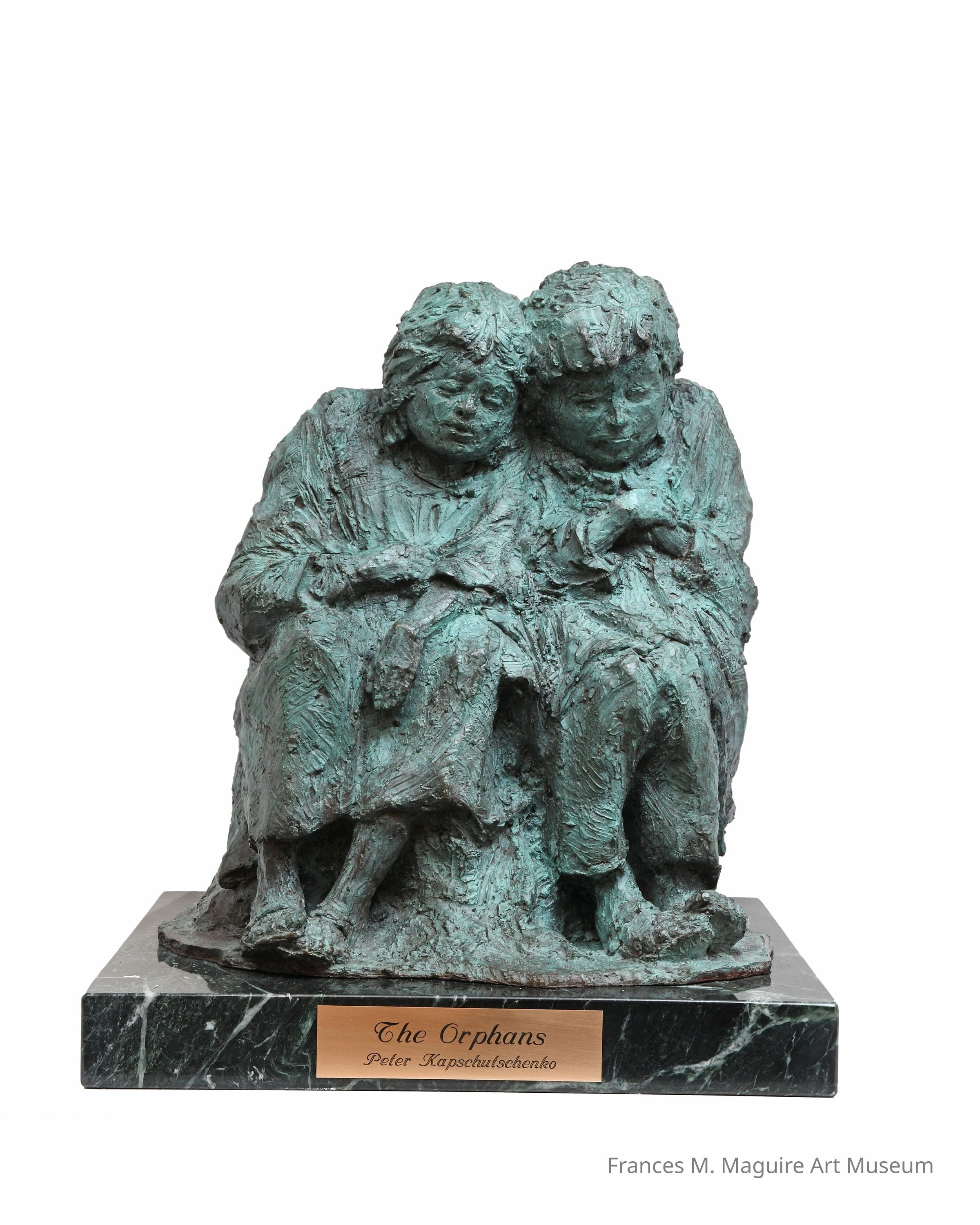Bronze sculpture of two orphans by Peter Kapschutschenko.