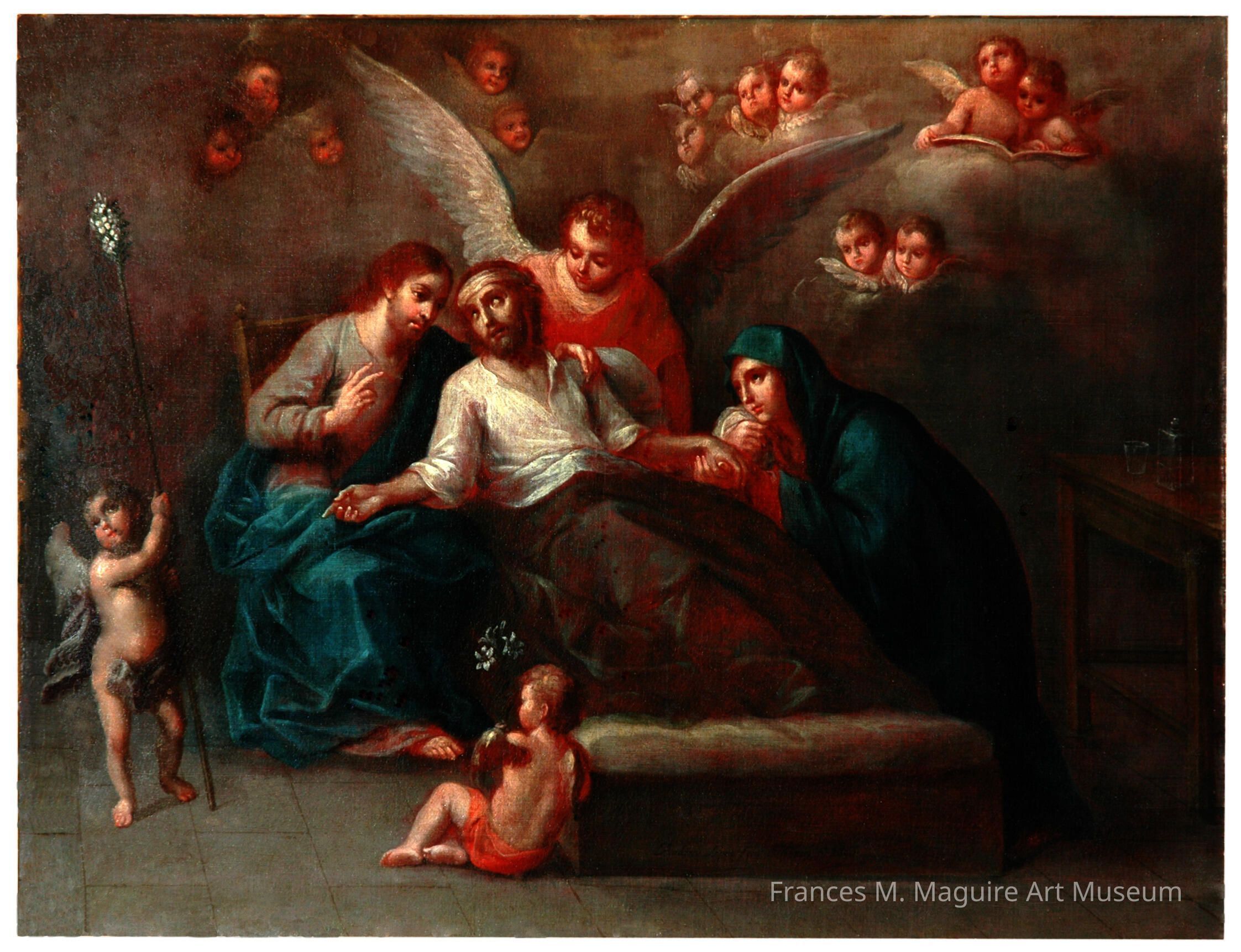 Early-19th-c. Mexican painting of St. Joseph dying with Mary, Jesus, and angels by his side.Made/Created