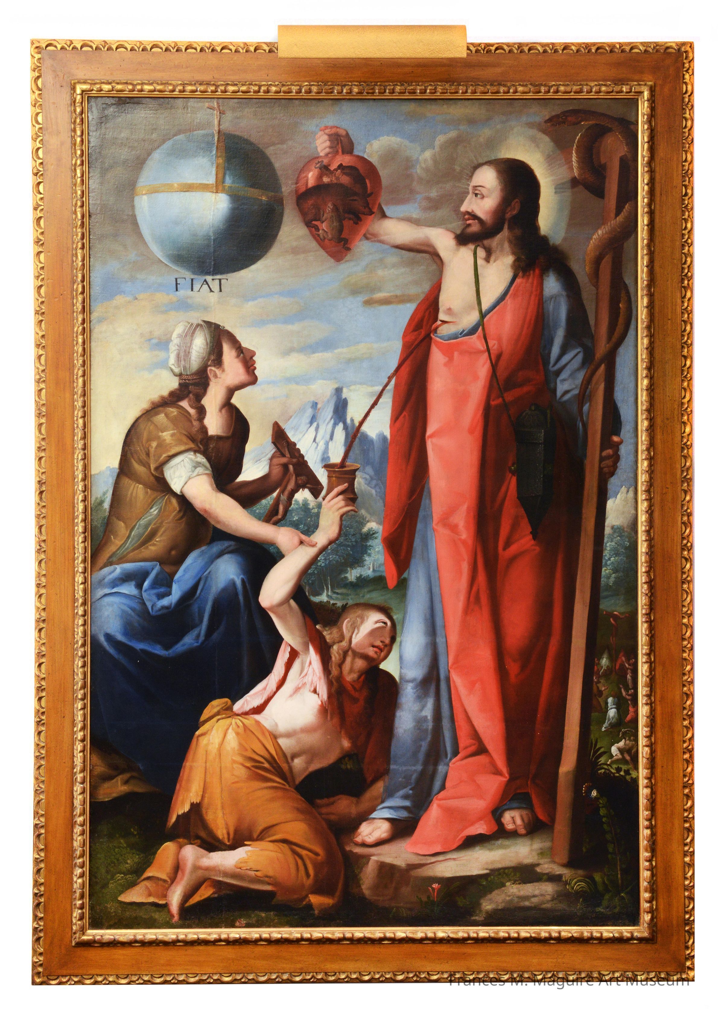 The message that Christ could heal the faithful who were ill and suffering was a powerful one in Spanish America that aided in evangelization efforts. The portrayal of Christ as divine physician is based on a 16th-c. engraving by the Dutch artist Hendrick Goltzius. Jesus holds a human heart infected by sin (the pig, frog, and money bag are symbols of evil) and a large cross with the serpent of Moses. Blood flows from Christ’s wound to a cup held by a sickly female figure. She is supported by a personification of Faith; above is an orb inscribed with “FIAT,” signifying creation and redemption.Dimensions