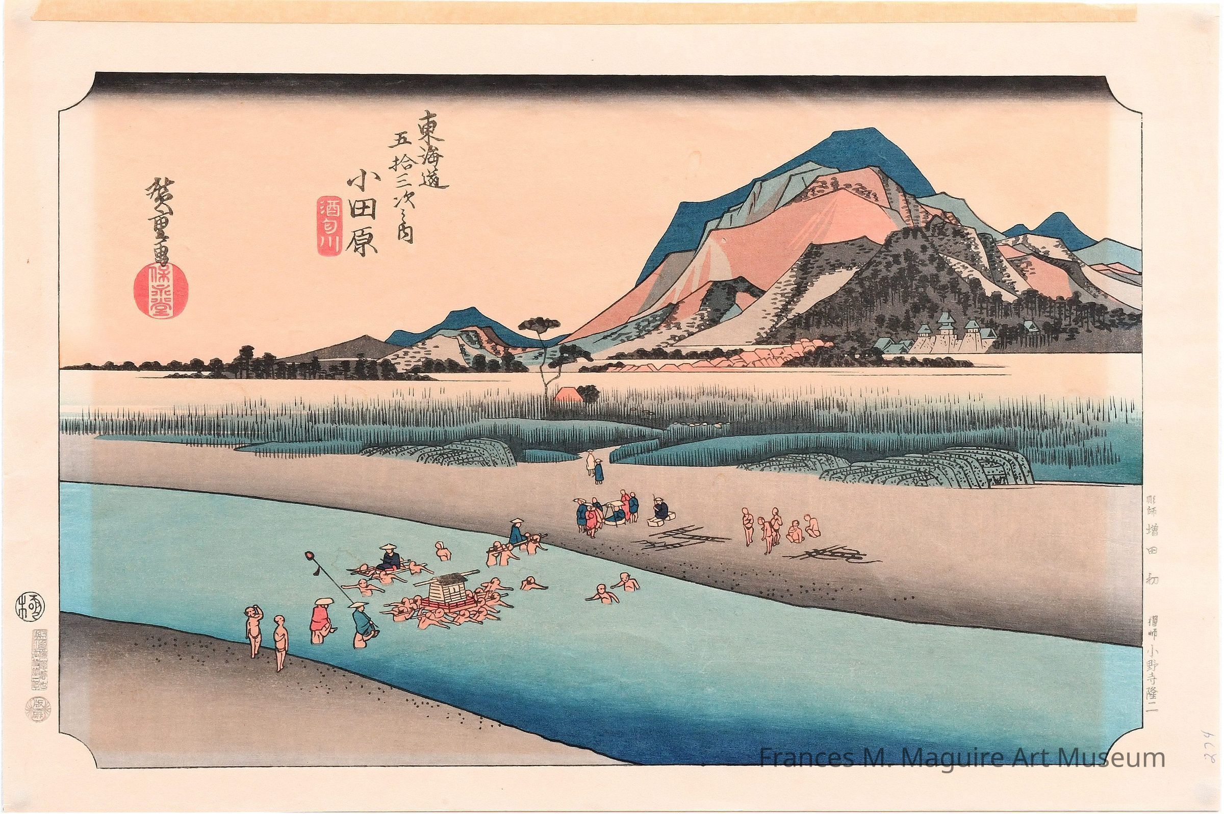Odawara was the first castle travelers would reach after leaving Edo. A stronghold of this region of Japan, the castle is located in the upper right of the print, in the foothills of the mountains. In the foreground, travelers ford the Sakawa River, which was difficult to cross because of its strong currents. This image illustrates well the strenuous tasks the travelers faced along their journey. Hiroshige made four versions of this scene with varying numbers of figures. This one, with only two figures on the nearby bank, is the earliest.Label Type