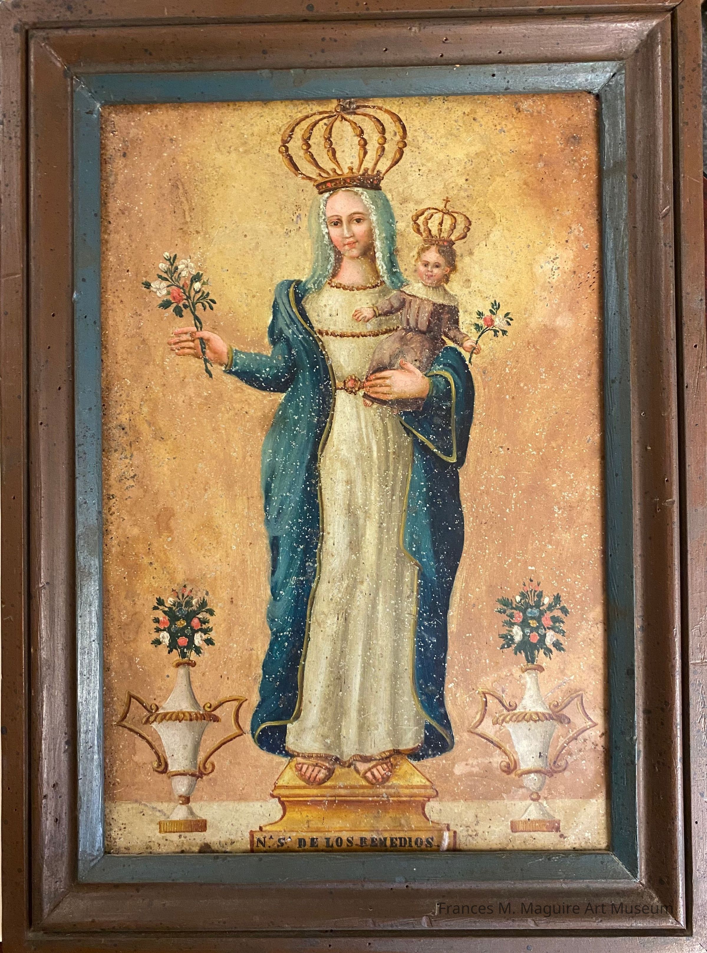 19th-c. Mexican retablo of Our Lady of Los Remedios (a title of the Virgin Mary) with the Christ Child.Dimensions