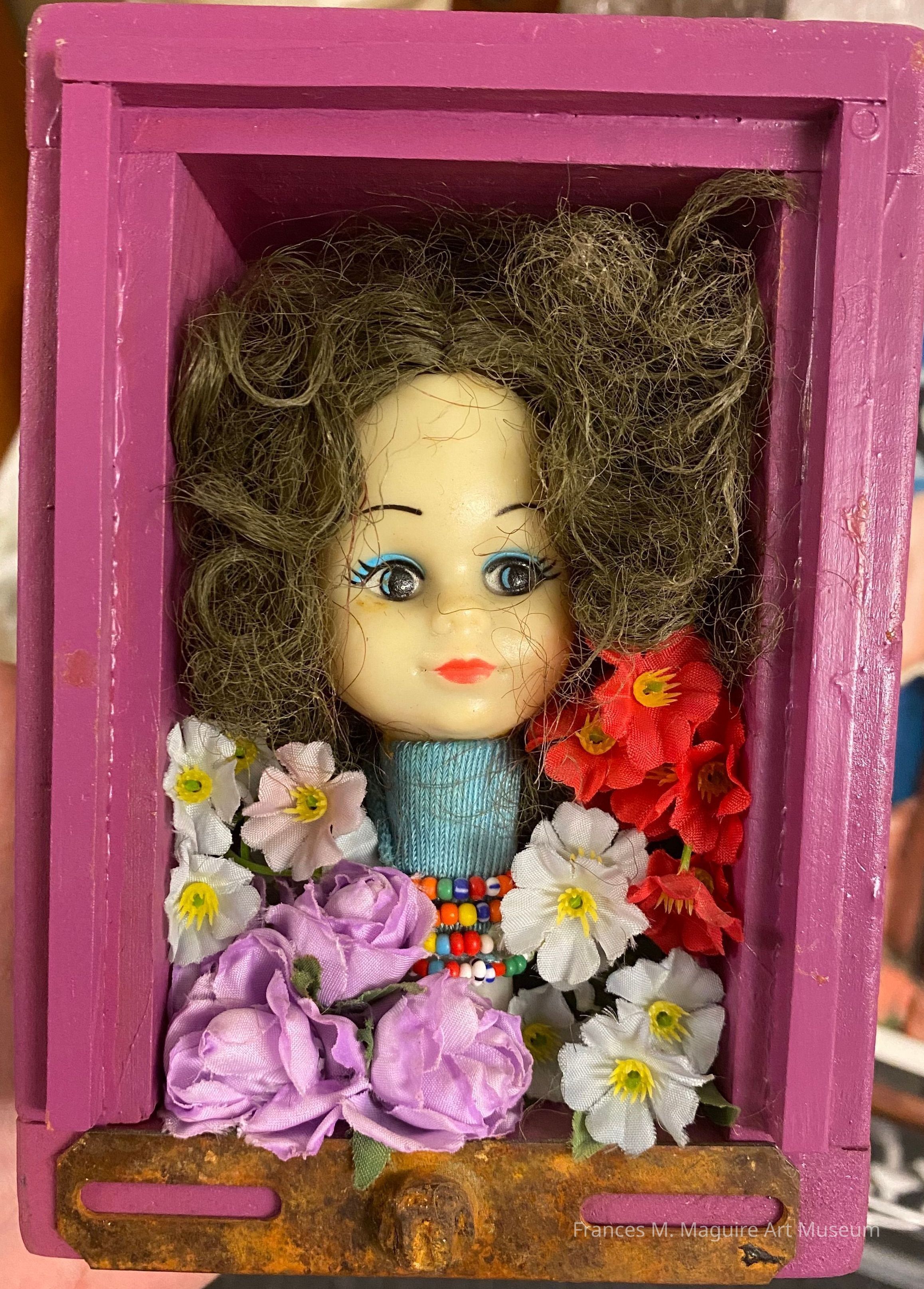 20th-c. mixed media box construction consisting of a doll head and flowers.