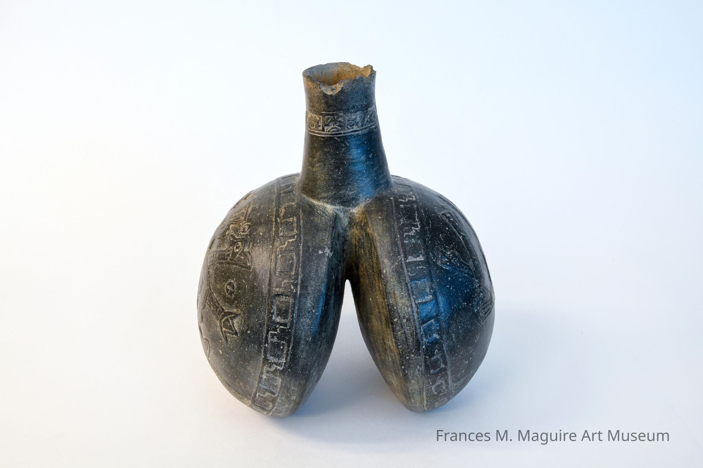 Chimú mold made Blackware double-bodied vessel in lung form and decorated in low relief with mythical animals.Made/Created