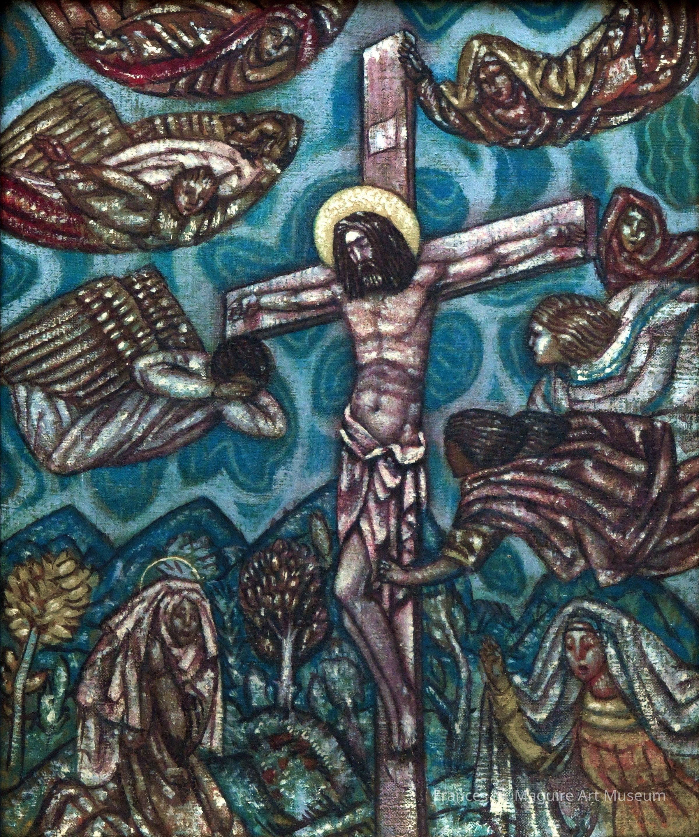 20th-c. painting of Christ on the crucifix surrounded by angels, Mary Magdalene, and the Virgin Mary.Made/Created