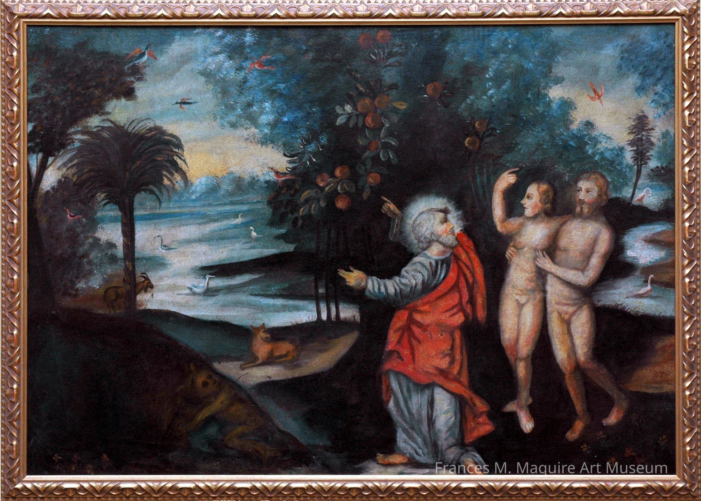 20th-c. reproduction of a Colonial Peruvian painting of Adam and Eve (and perhaps God the Father) in the Garden of Eden.Interpretative Labels