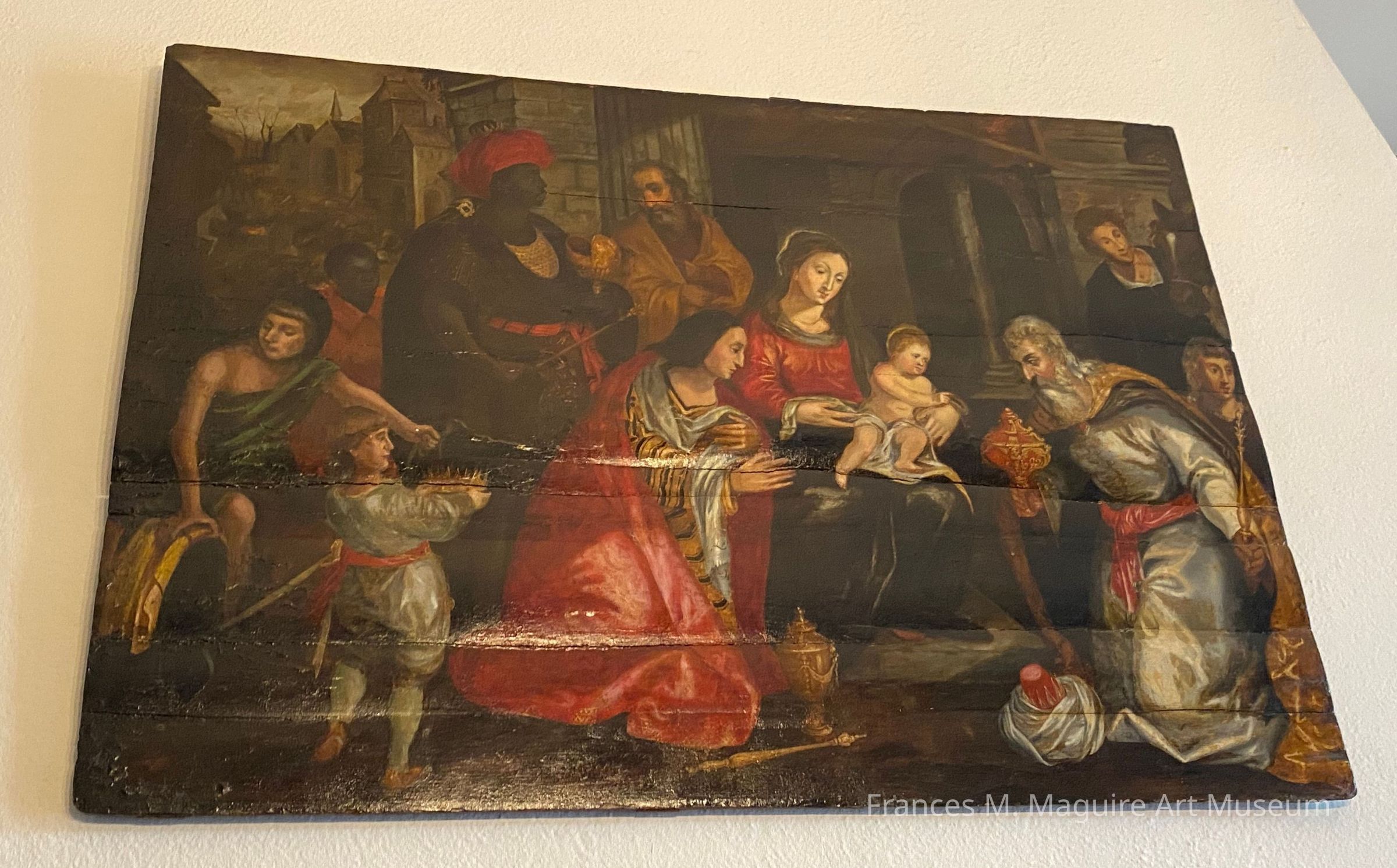 18th-c. oil painting on wood panel of the Magi visiting the Holy Family.