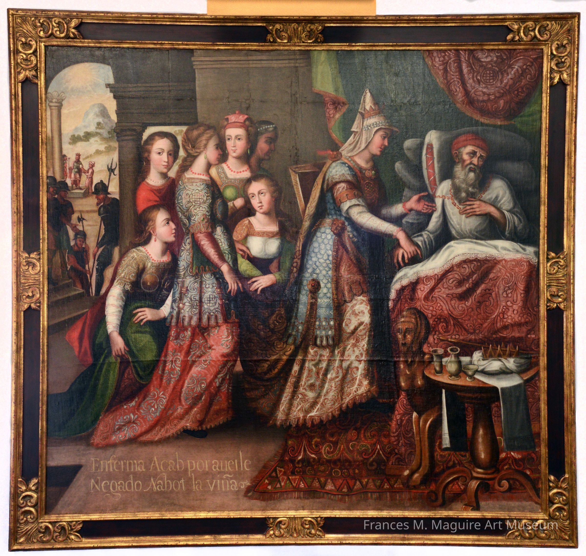 18th-c. Peruvian painting of Ahab and Jezebel in 1 Kings 21. Ahab gets sick after Naboth refused to give him his vineyard.Dimensions
