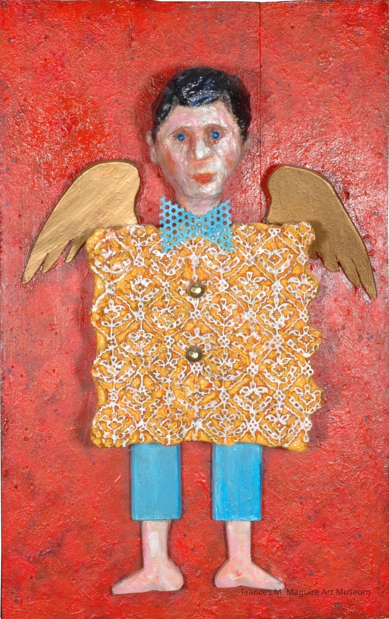 Mixed media construction of an angel made from clay and an Indian textile printing block.