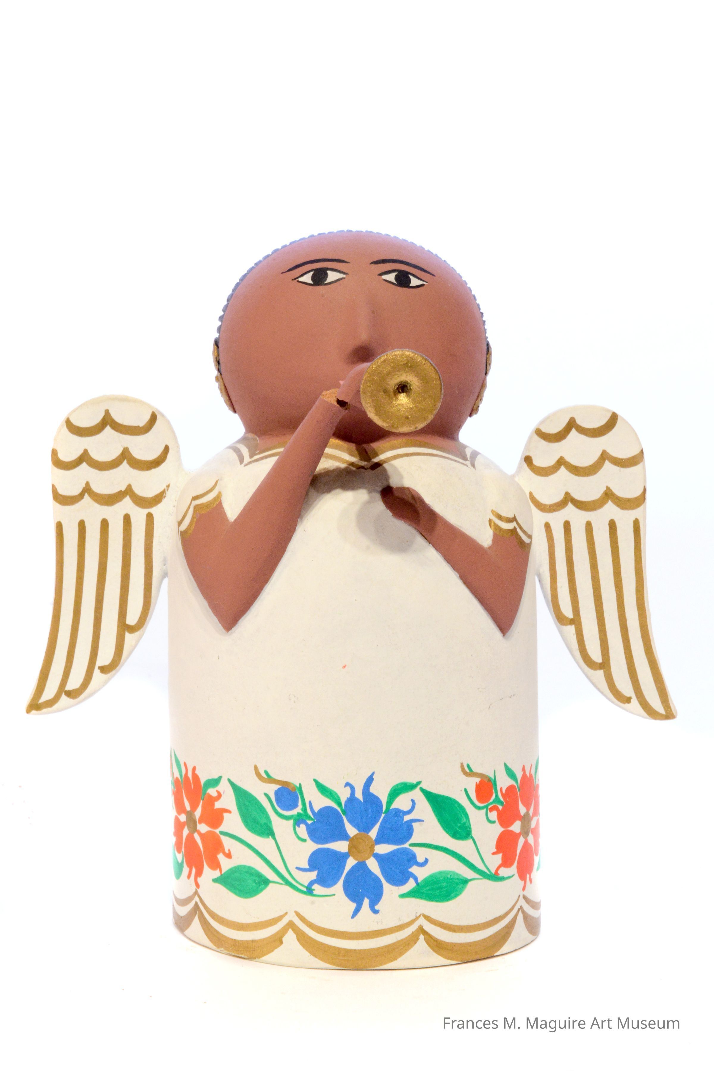 20th-c. Mexican sculpture of a rotund angel blowing the trumpet. The angel's white tunic features a floral border and gold detailing.Artwork Details