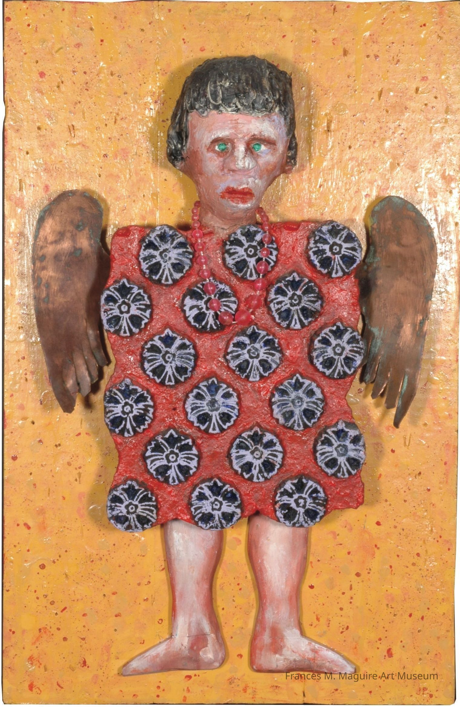 Mixed media construction of an angel made from clay and an Indian textile printing block.