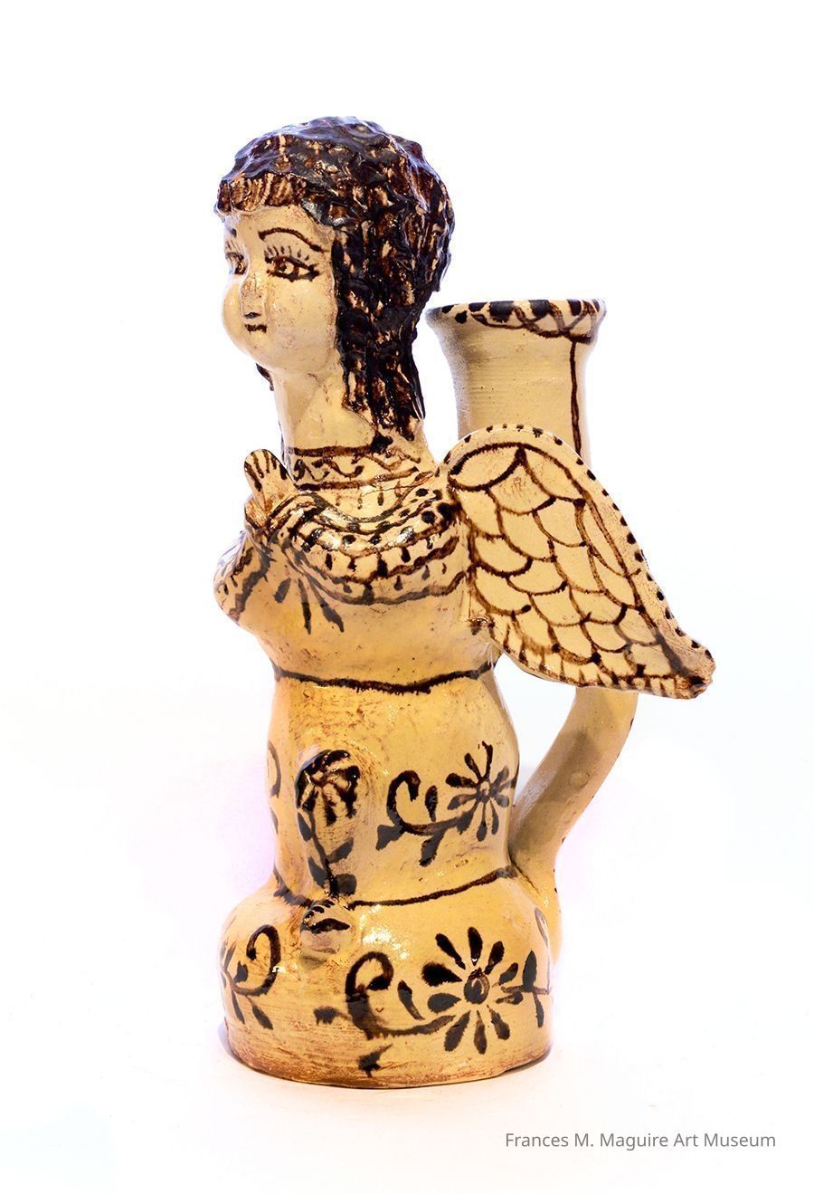 20th-c. Mexican candleholder in the shape of an angel. This ceramic piece is decorated with white glaze and black line work. Part of a set of three angel candleholders.Interpretative Labels