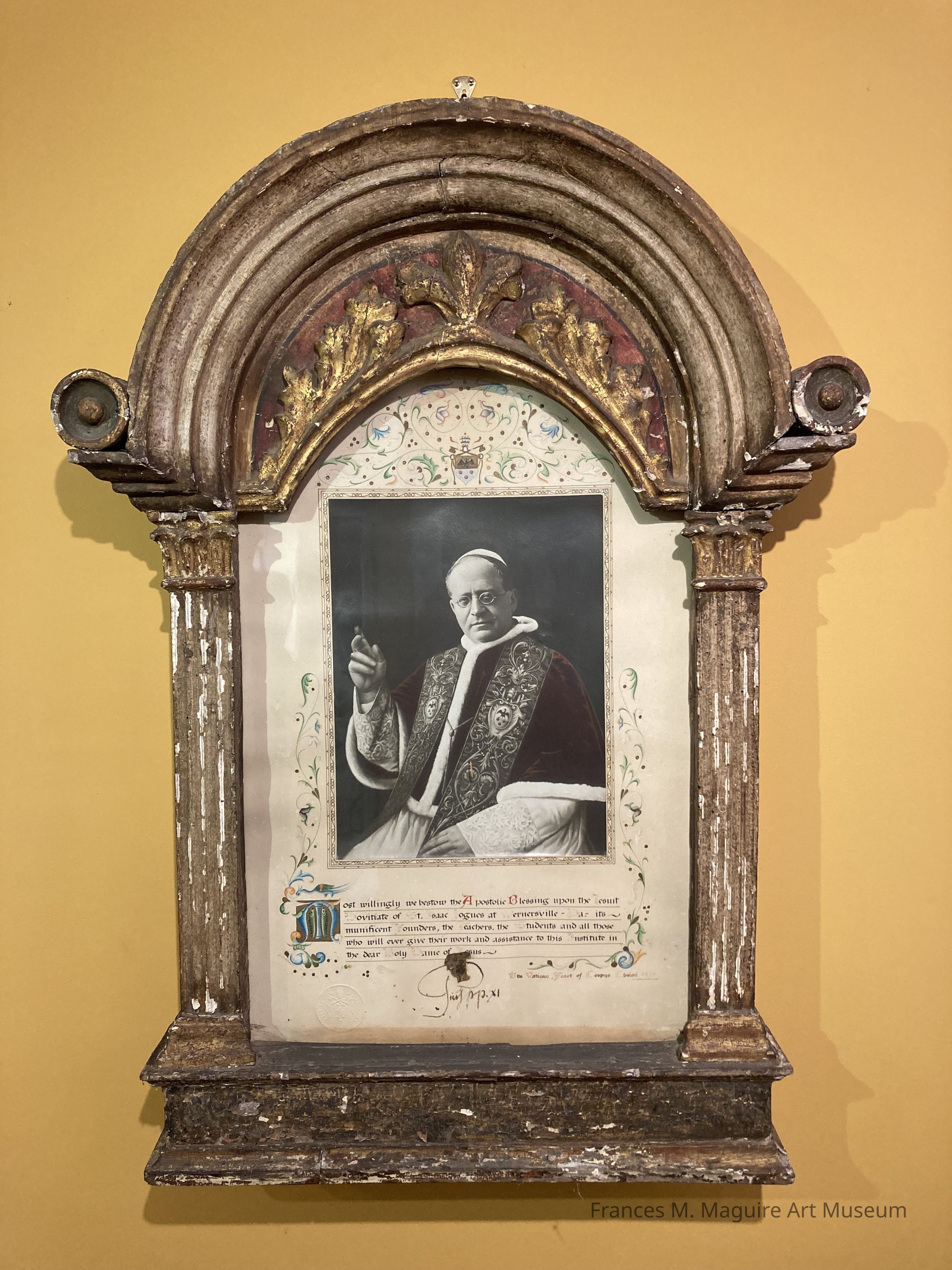 An Apostolic Blessing given to the Jesuit Novitate at Wernersville by Pope Pius XI, featuring a photograph of the Pope, illuminated letters and marginal decoration, and the Pope's signature.Made/Created