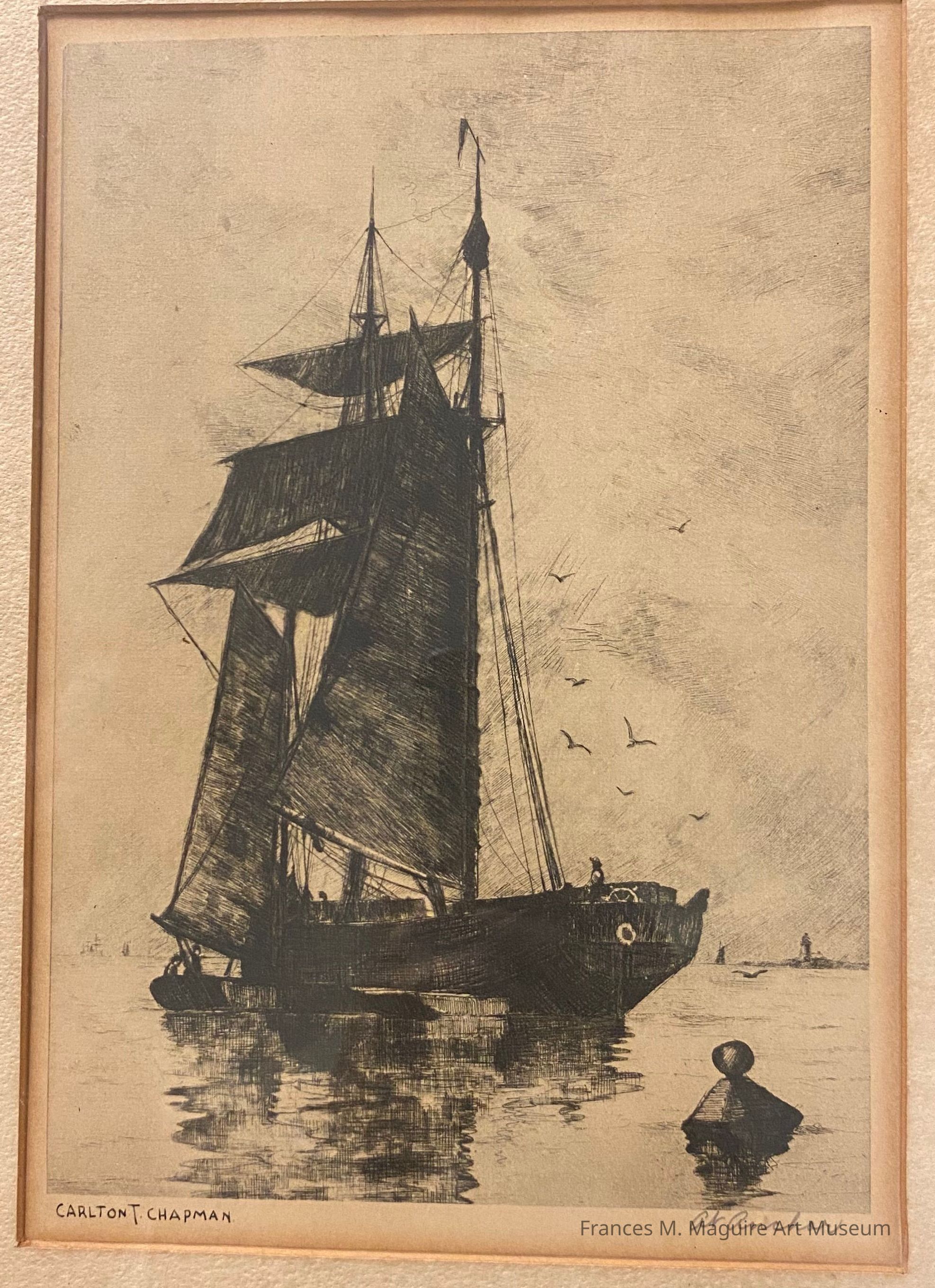 Etching of an anchored sailboat.