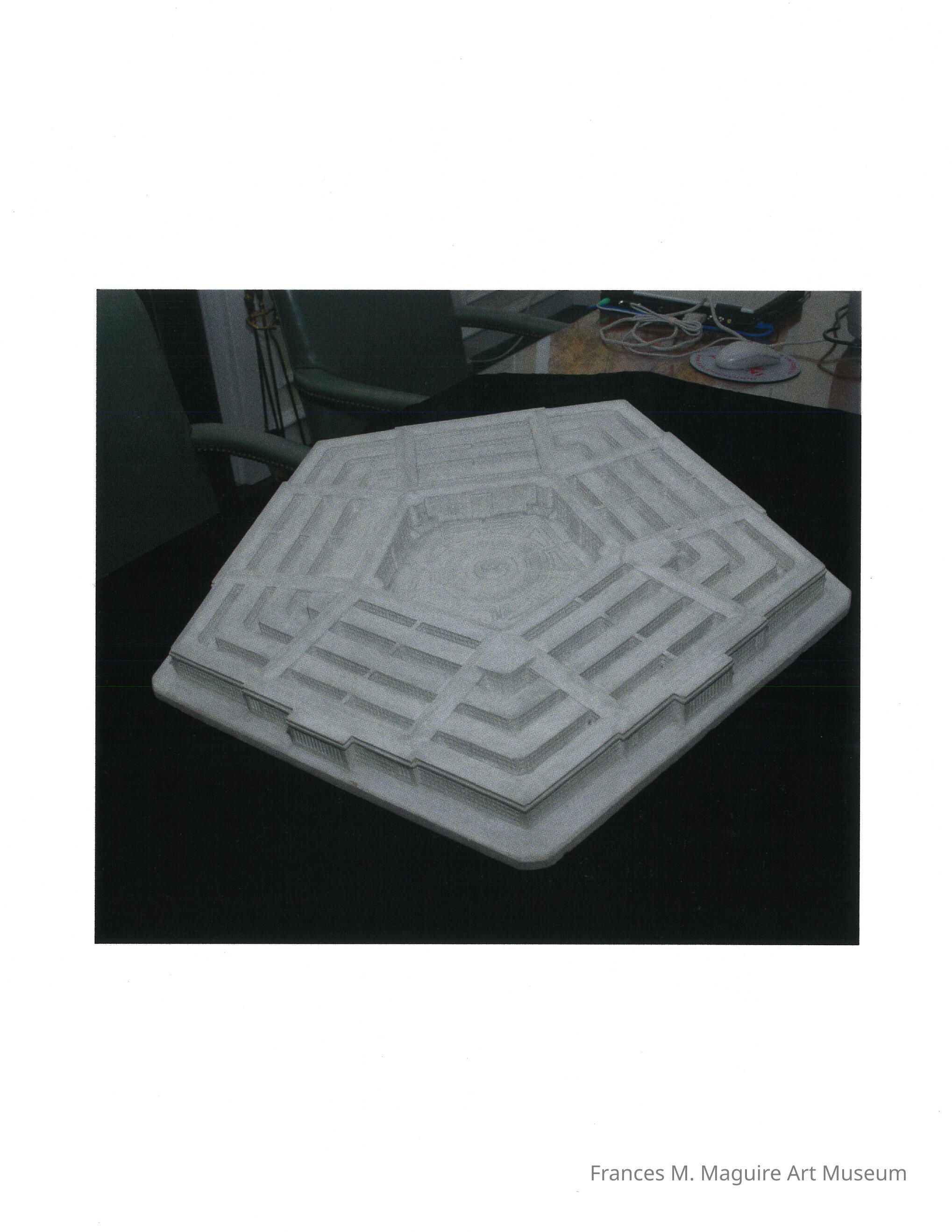 This architectural model of the Pentagon, has, of course, five sides, is 15" L., and is made of plaster. It was cleaned by Ebenezer Kotei in 1996 at the Hagley Museum. The conservation report is on file at SJU.