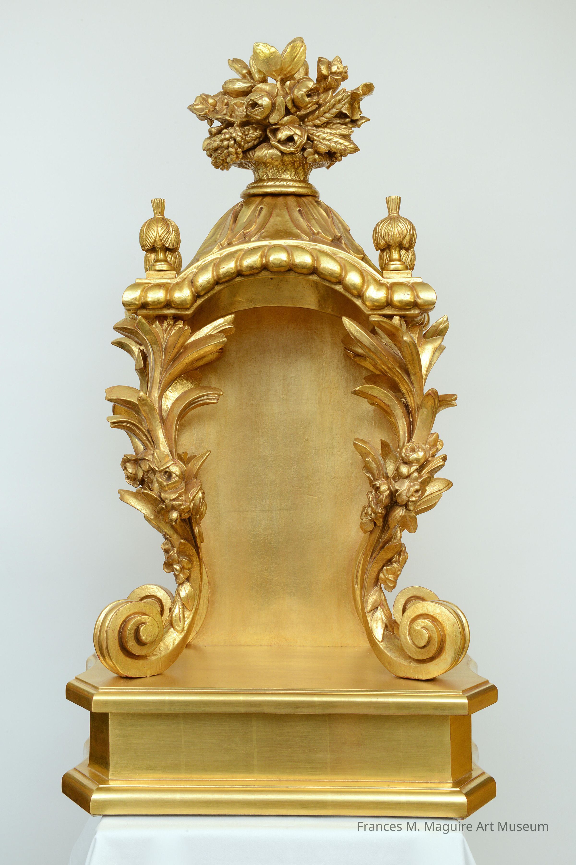 A niche is a semi-circular apse or recess that is partially covered with a semi-dome. Niches were typically placed in churches, chapels, and wealthy private homes. This ornately carved and gilded example would have held a religious object of devotion, like the one seen here. The Baroque style of the niche proliferated in Latin America in the 18th c. and is characterized by its curved, spiral lines, floral decoration, and use of luxurious materials such as gold leaf.