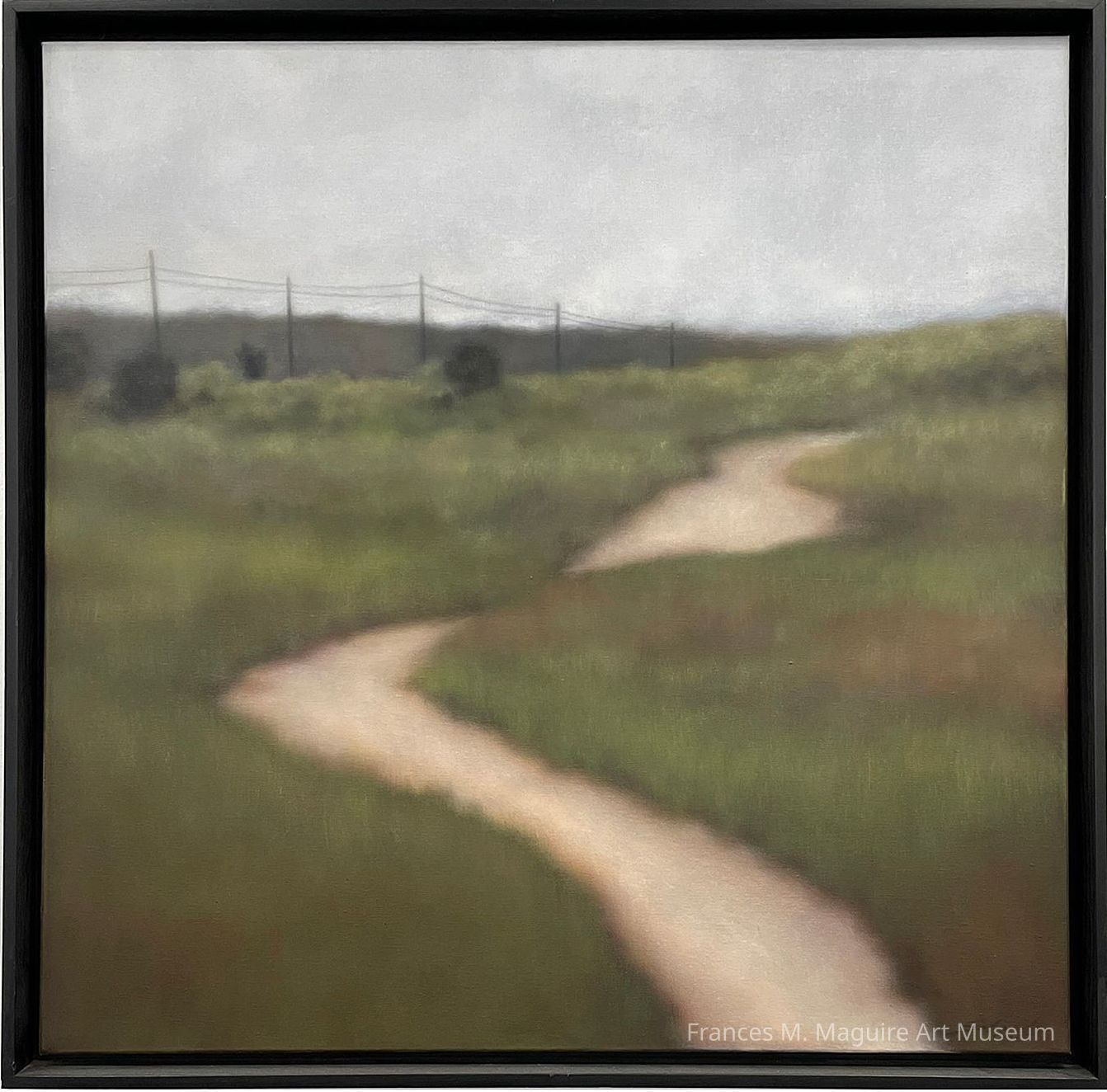 21st-c. oil on linen painting of a winding beach path with phone lines in the distance.Made/Created