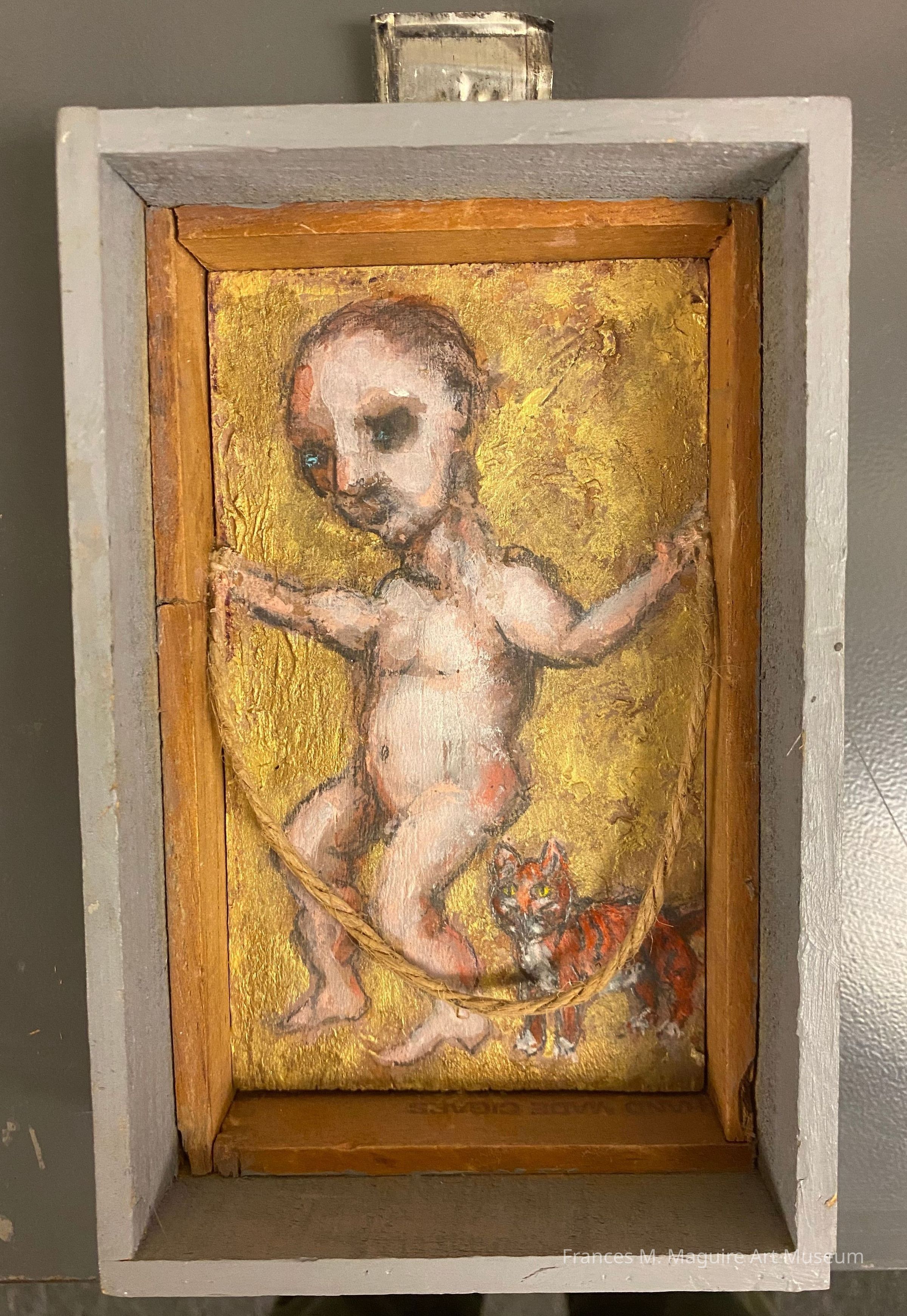 20th-c. mixed media box construction of baby with a rope next to a cat.