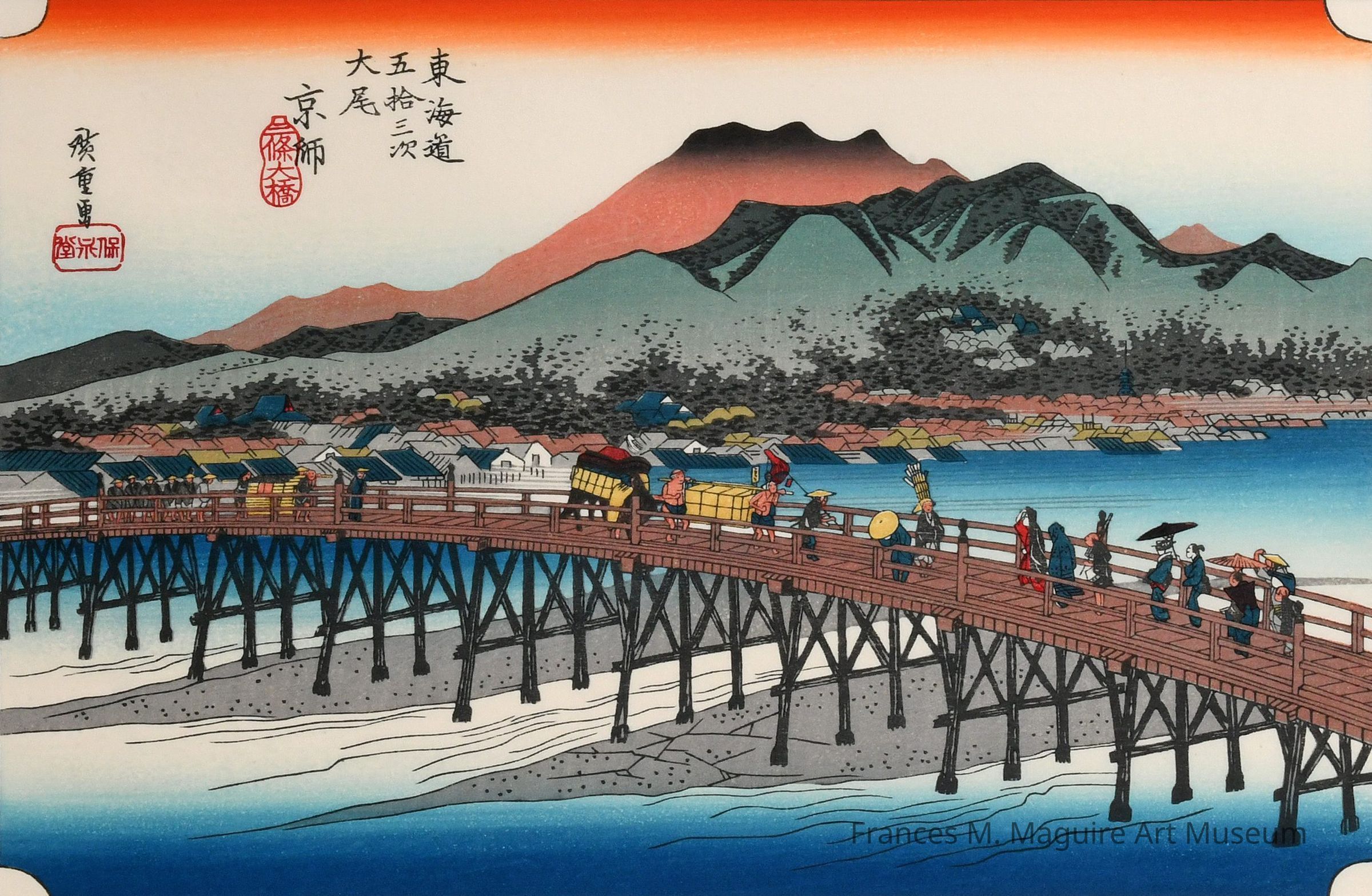 The final print in this series depicts the Sanjō Bridge stretching across Kyoto’s Kamo River, symbolizing the end of the long journey from Edo. Merchants, samurai, farmers, pilgrims, and tourists are shown crossing the bridge. The broad spectrum of travelers reflects the diverse social classes in Edo-era Japan. Hiroshige’s panoramic angle invites you to explore the bustling scene, while his delicate use of color gradation, or bokashi, elevates a peaceful and serene backdrop. With this series of prints, he immortalized the importance of the Tōkaidō route, and his innovative style later inspired Western artists including Claude Monet and Vincent van Gogh.Label Type
