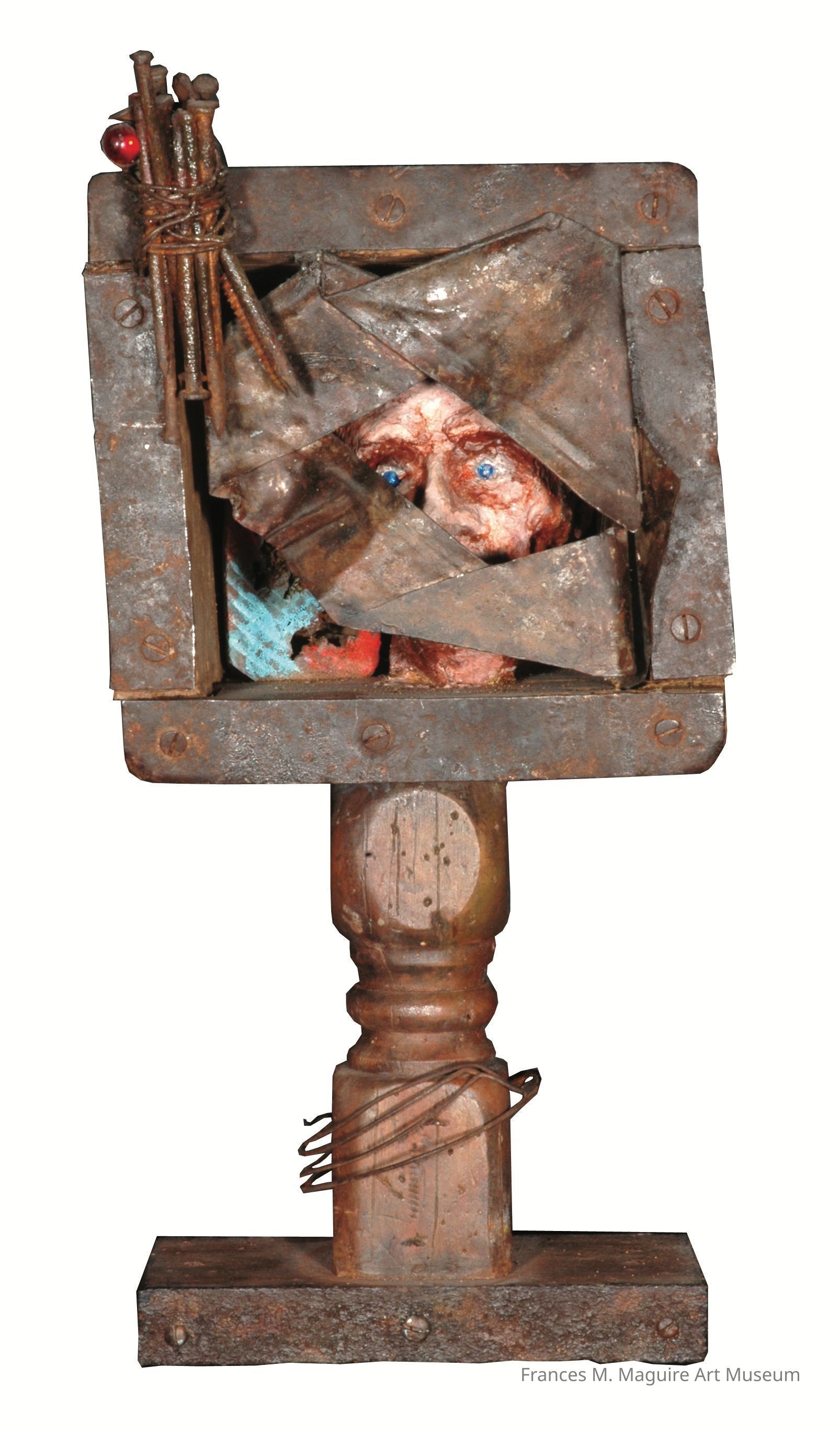 20th-c. mixed media box construction made of metal, wood, papier-mâché, nails, wire, and paint. In this piece, a person's head is trapped in a box on a pedestal base.