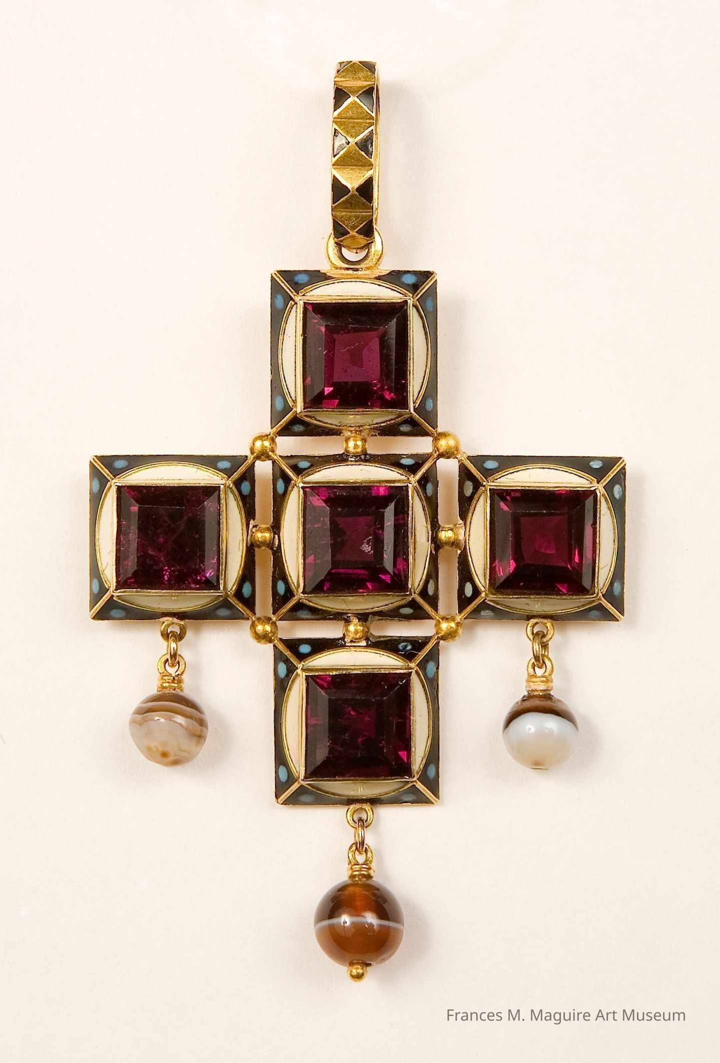 19th-c. 18K gold cross pendant with 5 amethysts and 3 agate dropsMade/Created