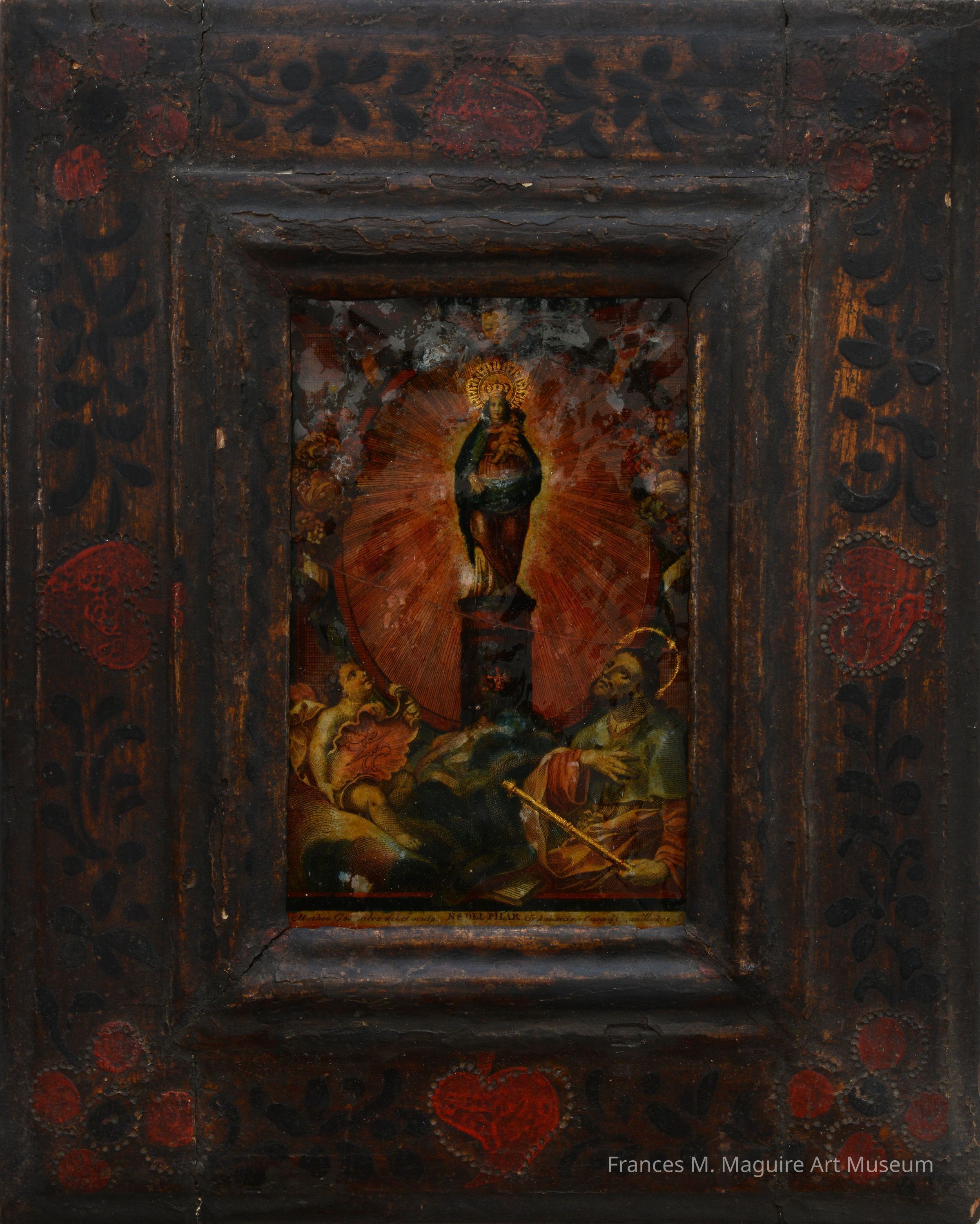 18th-c. Spanish hand-colored and gilded engraving fused behind glass of Our Lady of the Pillar and St. James.Made/Created