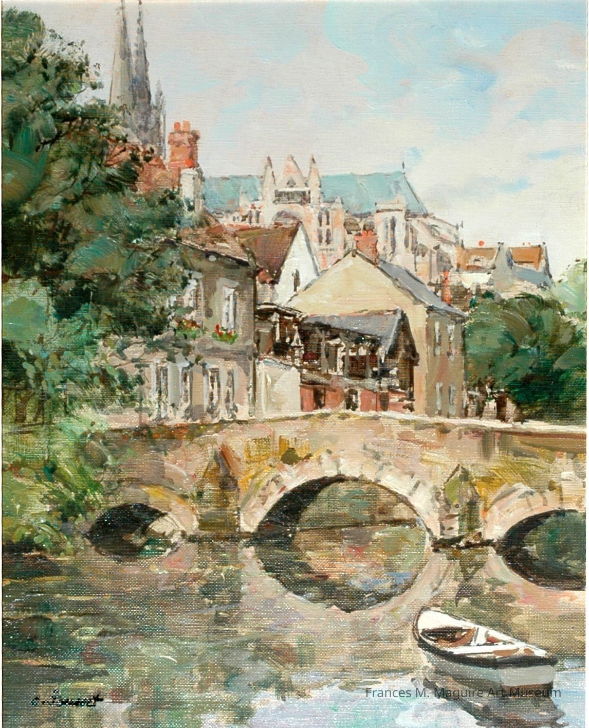 20th-c. painting of a bridge on the Eure River in Chartres, France. Le Cathédrale Notre-Dame de Chartres or Chartres Cathedral is pictured in the distance.Made/Created