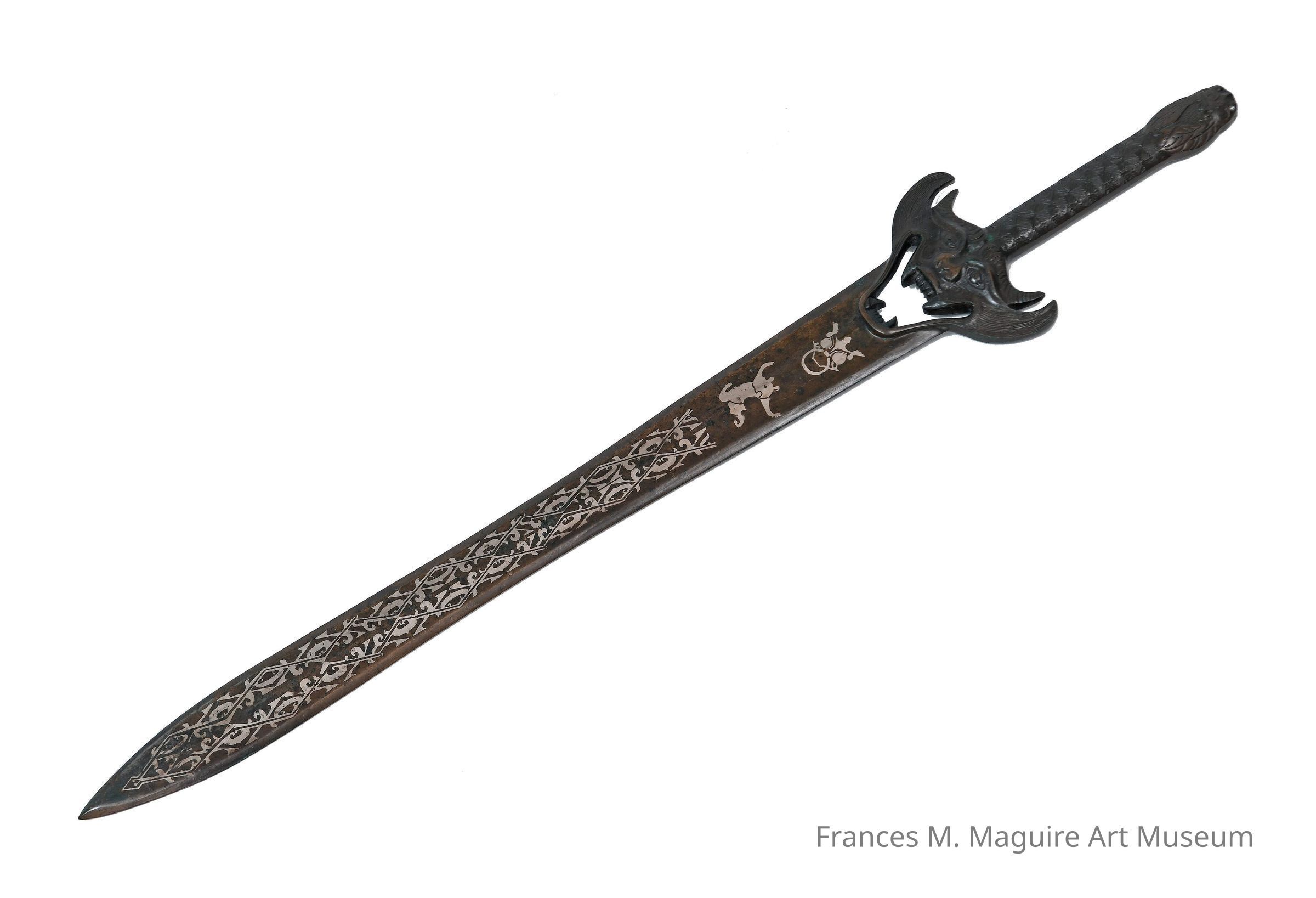 Chinese bronze sword with sculpted and incised handle and decorations on the shaft in silver gilt