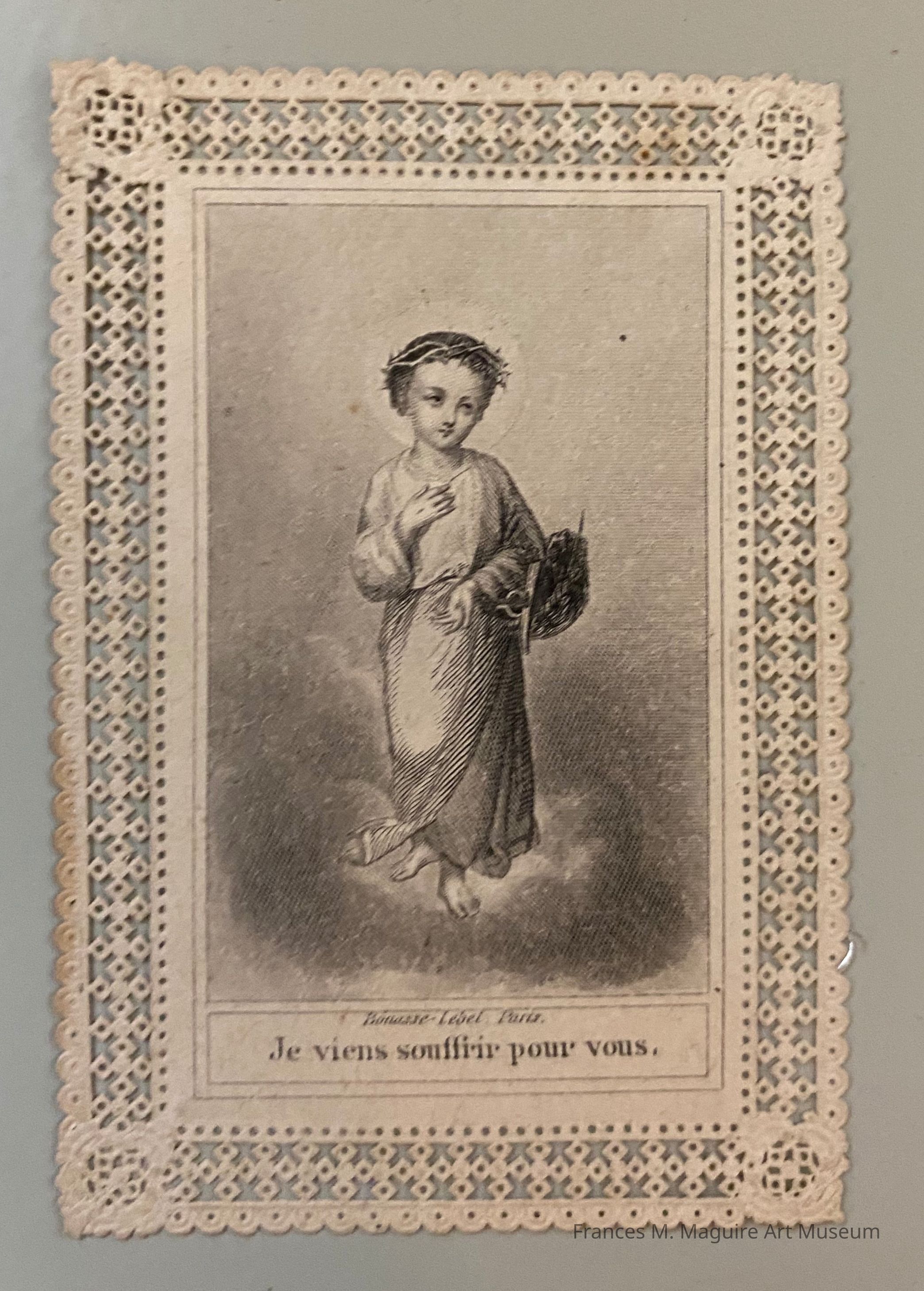 French holy card with a print of the Christ Child wearing a crown of thorns. The card has paper lace edges.