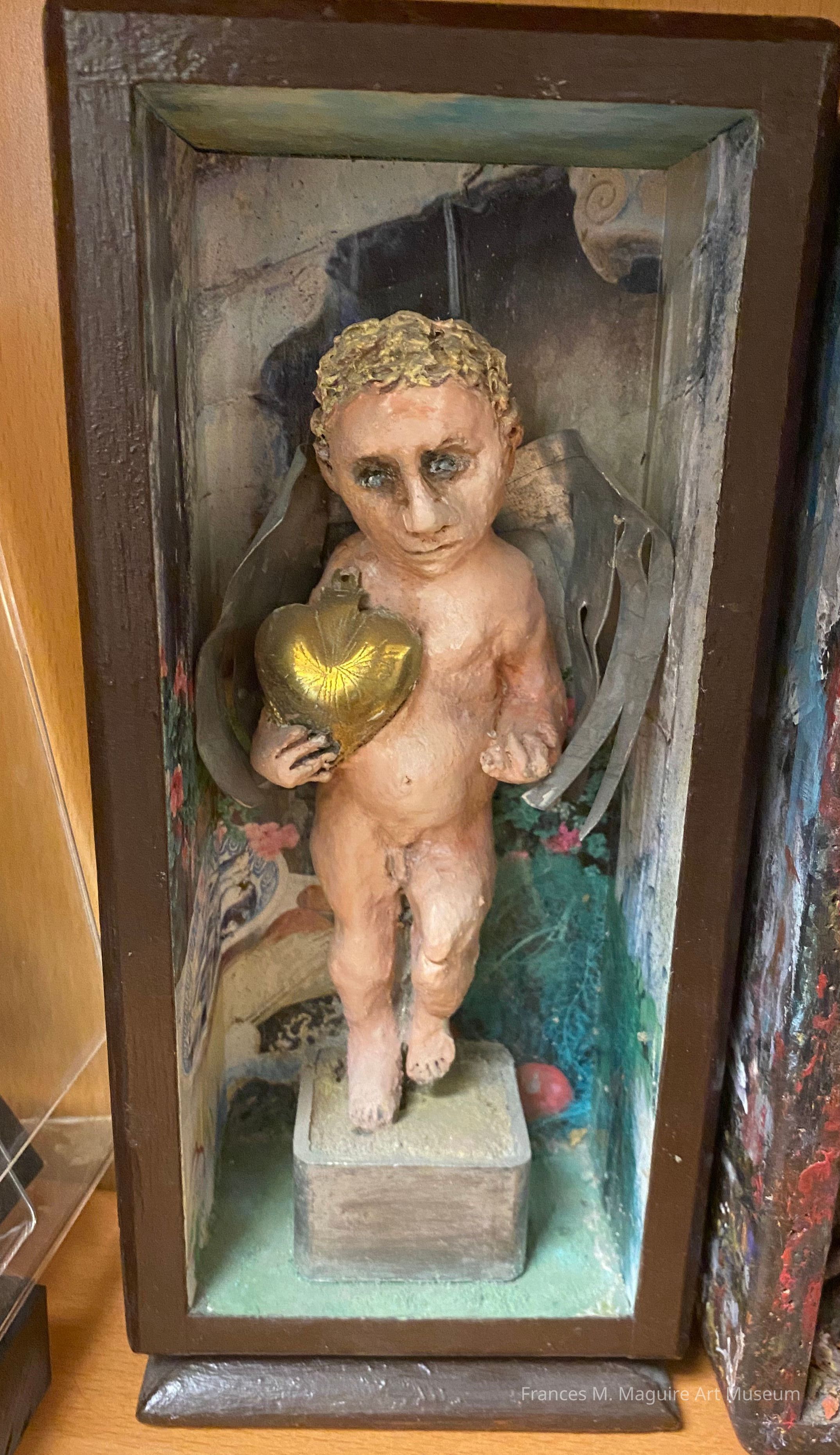 20th-c. mixed media box construction of Cupid holding a gold heart.