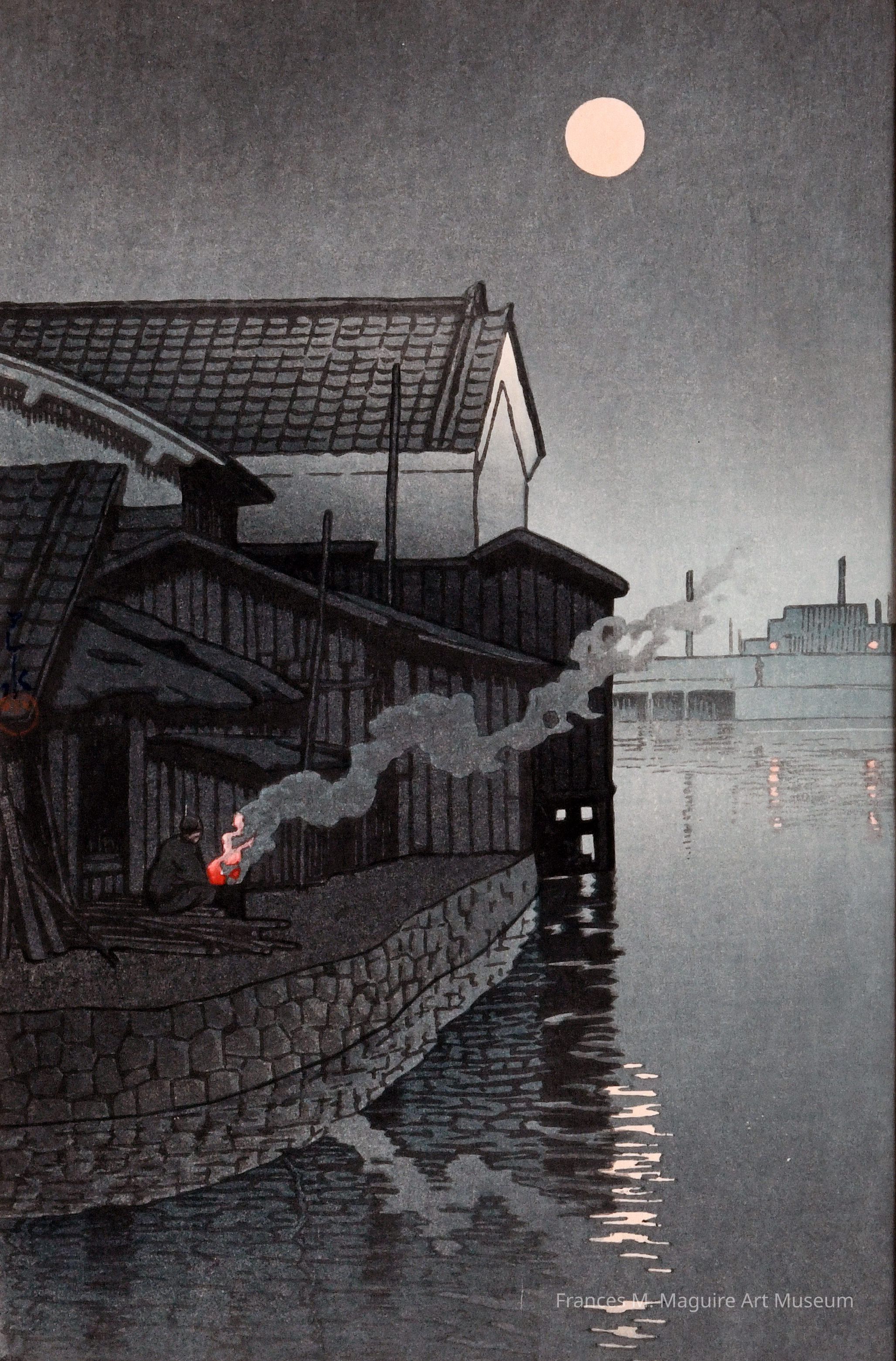 This print portrays Daimotsu, an industrial city in Japan, known for its factories and the Amagasaki Castle. Kawase demonstrates how beauty can be found in unlikely places during the quiet hours of the night. He leads our gaze between the fire and moon by using the most saturated colors for these two objects. He connects them together with the smoke and city in the background. The subtle shades of ink in the highlights of the water, sky, and building add to the three-dimensional quality of the artwork.Label Type