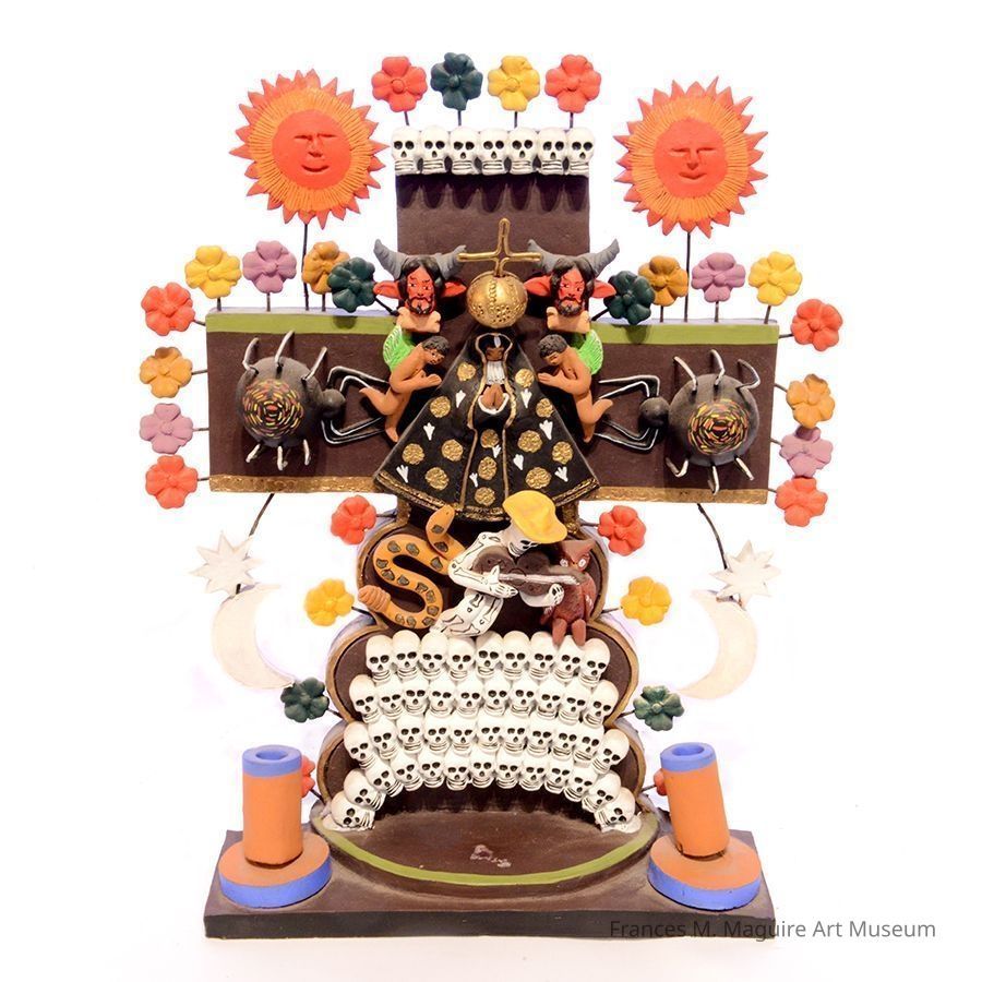 20th-c. Mexican folk art cross with Day of the Dead (Día de los Muertos) motifs. This colorful ceramic sculpture is likely a variation of the Tree of Life (Árbol de la vida), a type of Mexican sculpture. It features the Virgin of Soledad, skulls, suns, moons, flowers, spiders, angels, devils, a serpent, a skeleton, and two incense burners at the base.Made/Created