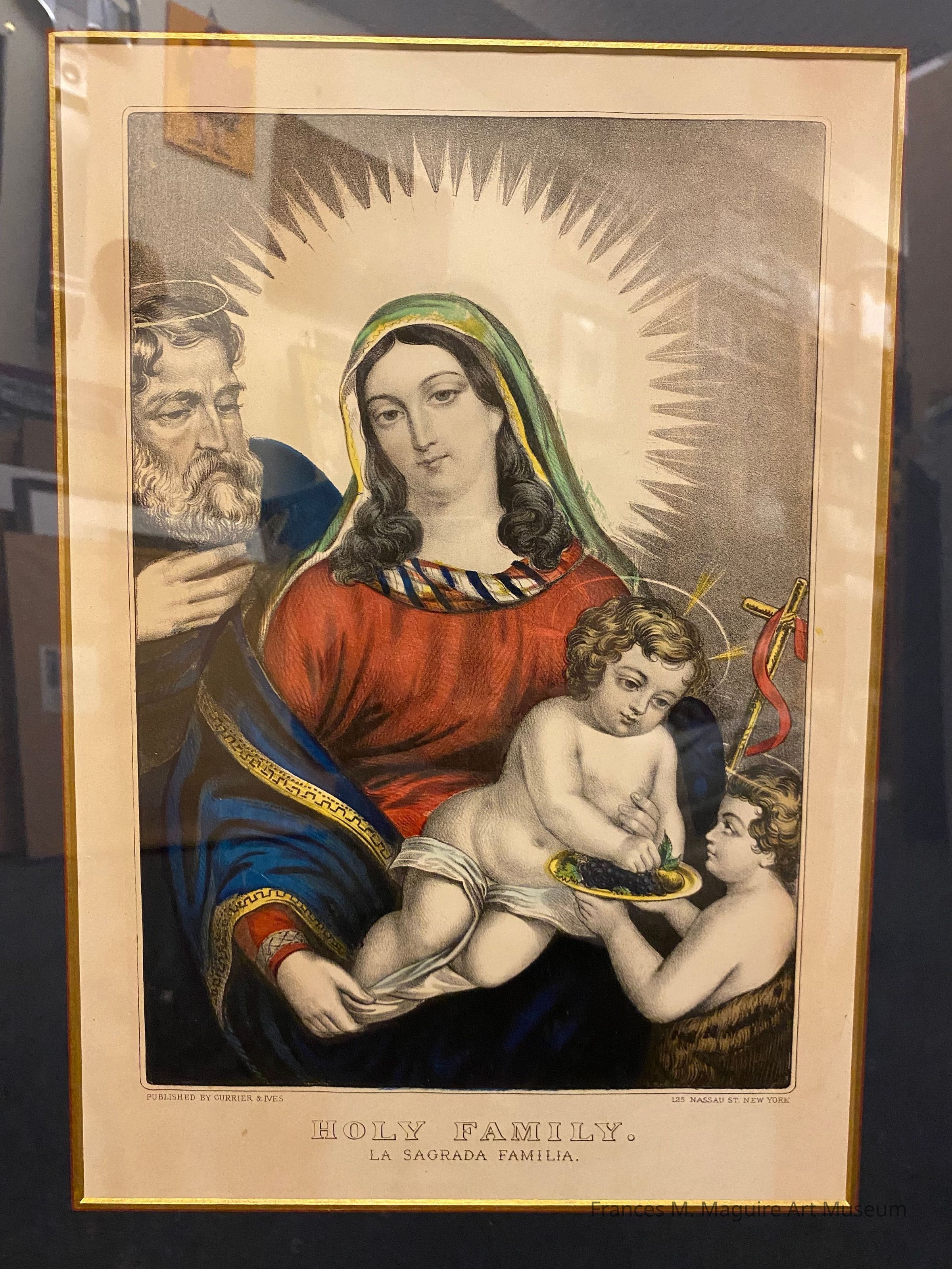 Hand-colored lithograph of the Holy Family with John the Baptist. Published by Currier & Ives, New York.Interpretative Labels