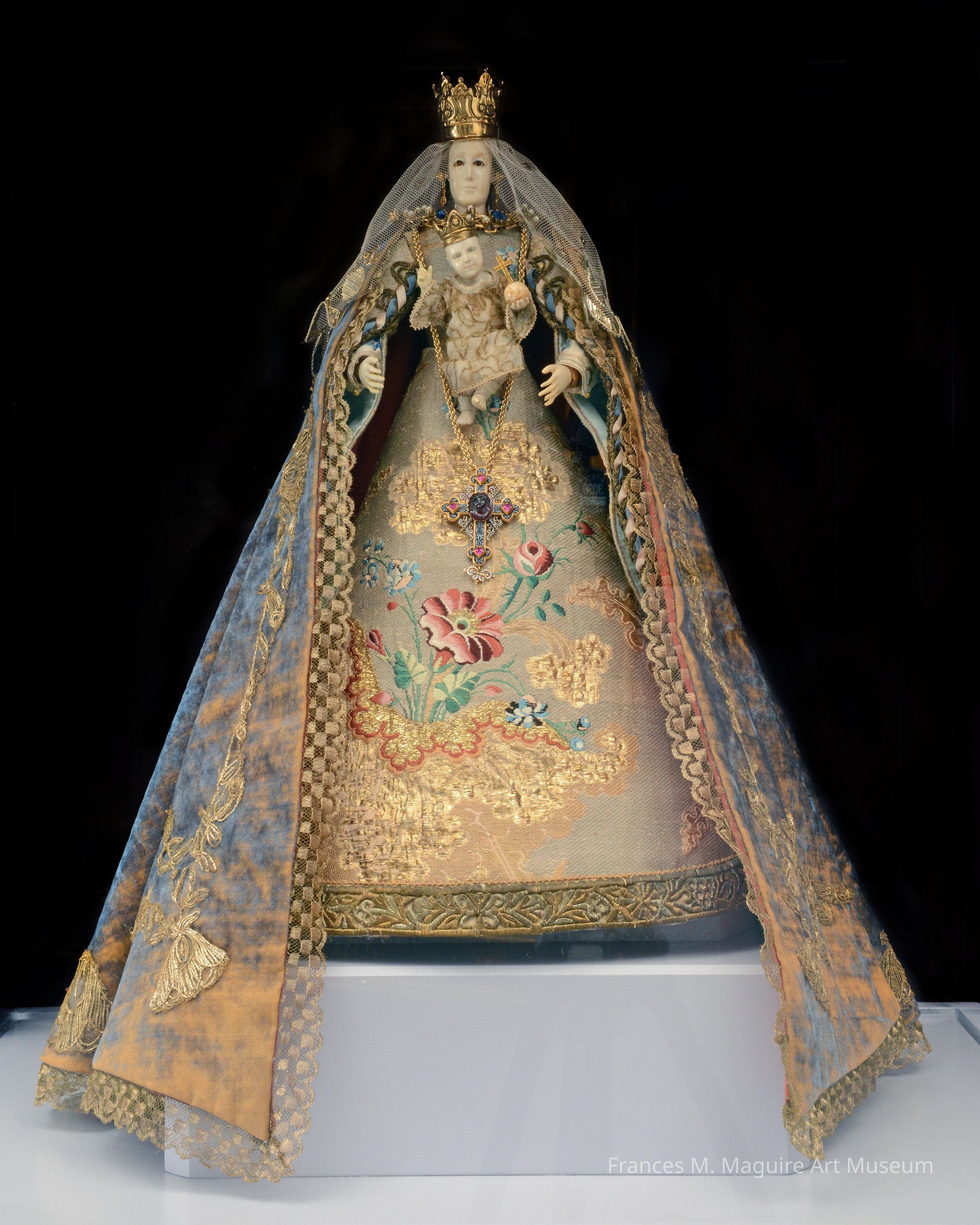 En España e Hispanoamérica fueron comunes las esculturas de Madonas vestidas con ropa real, estas se solían llevar en procesión y también se colocaban en nichos ricamente decorados. La muestra es una talla de madera aderezada con cabeza y manos de marfil, ojos de vidrio y una peluca hecha con pelo humano. Su lujosa vestimenta se ha recreado utilizando telas de la época, específicamente la seda bordada con hilos de plata y oro. El Niño Jesús sostiene una esfera sobre la cual hay una cruz que representa su dominio del mundo. Debido a su modesto tamaño y uso de materiales lujosos, posiblemente perteneciera a una familia acaudalada que la utilizaría de forma privada y por motivos devocionales.Artwork Details