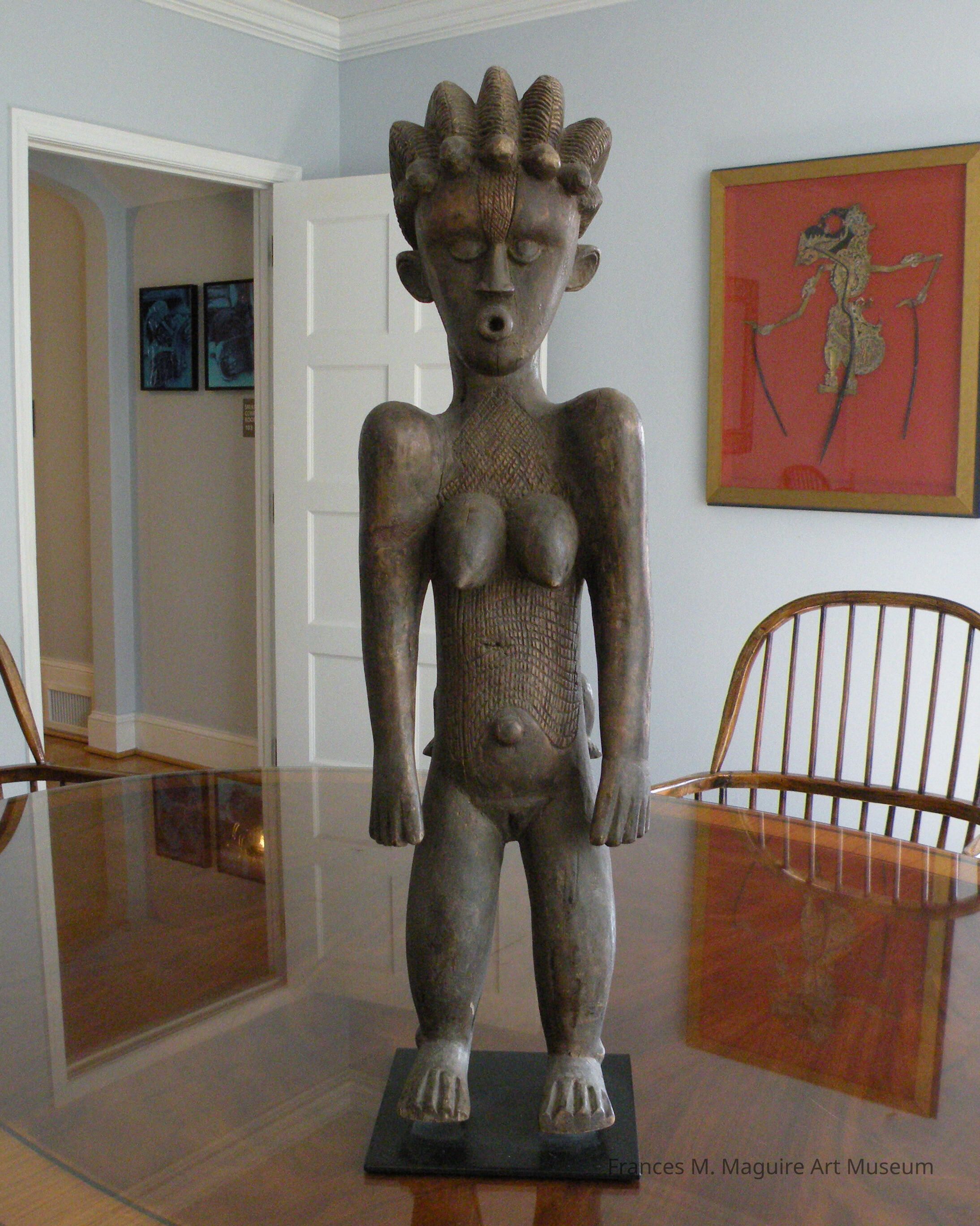 Wooden sculpture of a mother with a child clinging to her back.Dimensions