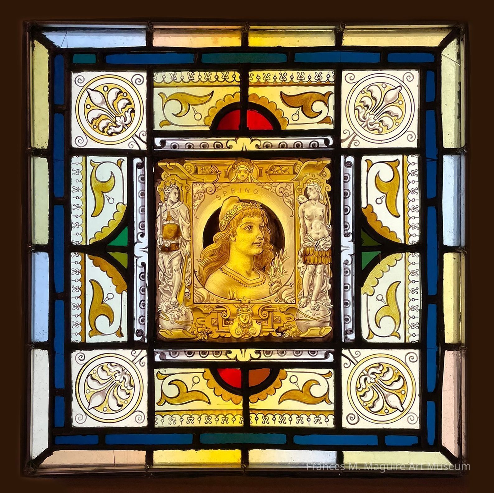 Stained glass panel in the Pre-Raphaelite style depicting a woman symbolizing Spring surrounded by decorative quarries.
