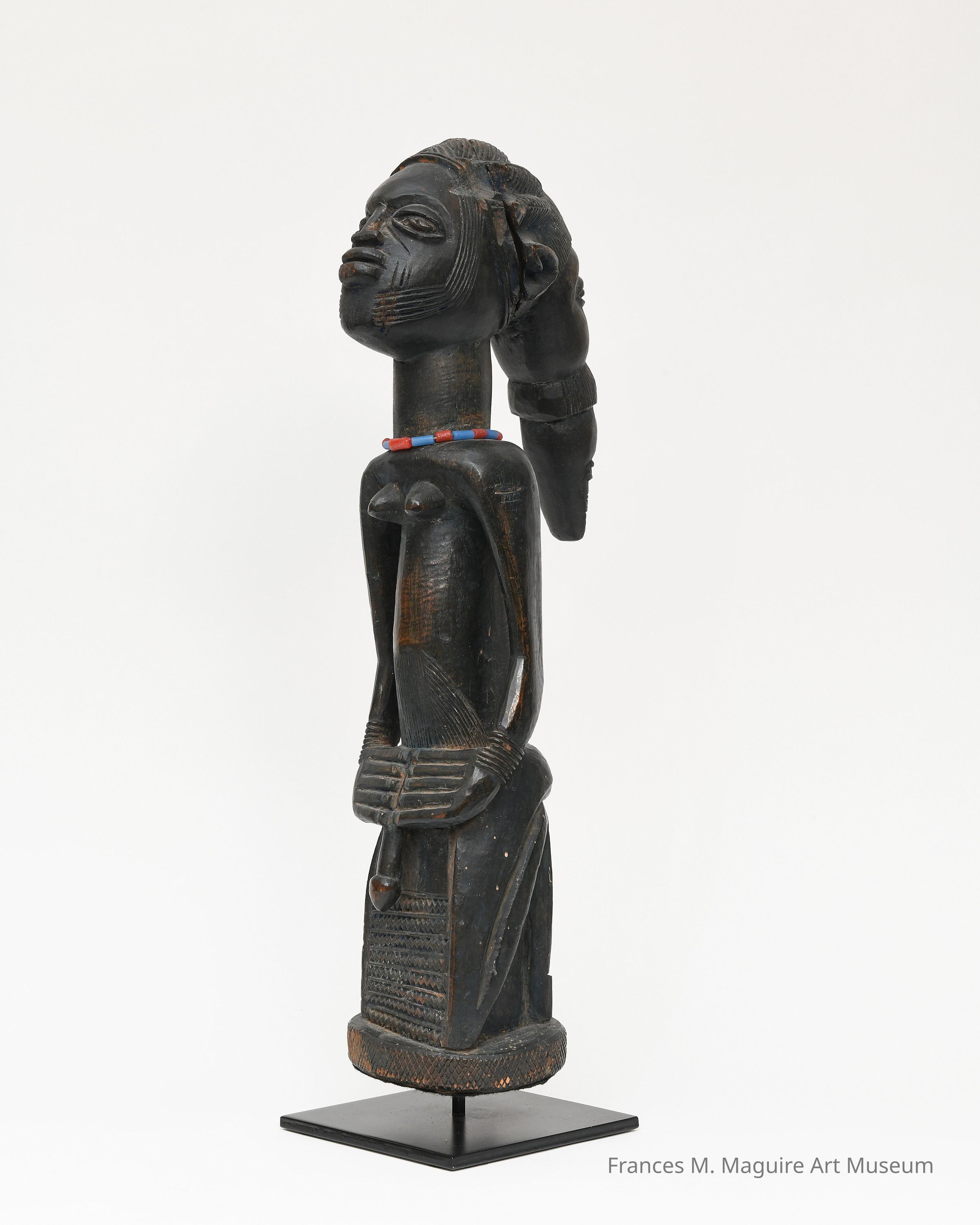 Eșu, the divine messenger, navigates between humans in aye and other deities in orun to resolve problems. On the crest behind Eșu’s head, two other faces represent his presence in the spirit world and evoke his capacity to exist in both worlds simultaneously. In this figure, Eșu’s mutability is also represented by the figure’s dual gender. Although generally benevolent, Eșu has a trickster side that can cause trouble if he is not treated properly. Cultivating a good relationship with Eșu is crucial for a person’s success in life. This figure was likely commissioned for a shrine dedicated to the deity in order to win his favor.