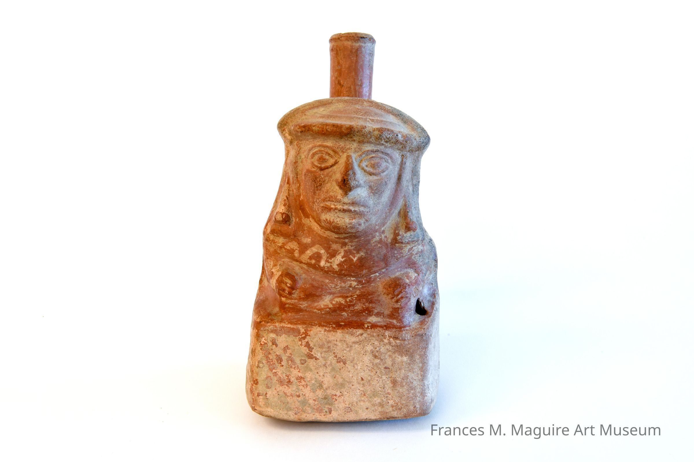 Early Mochica mold made pottery vessel in the form of a seated merchant.