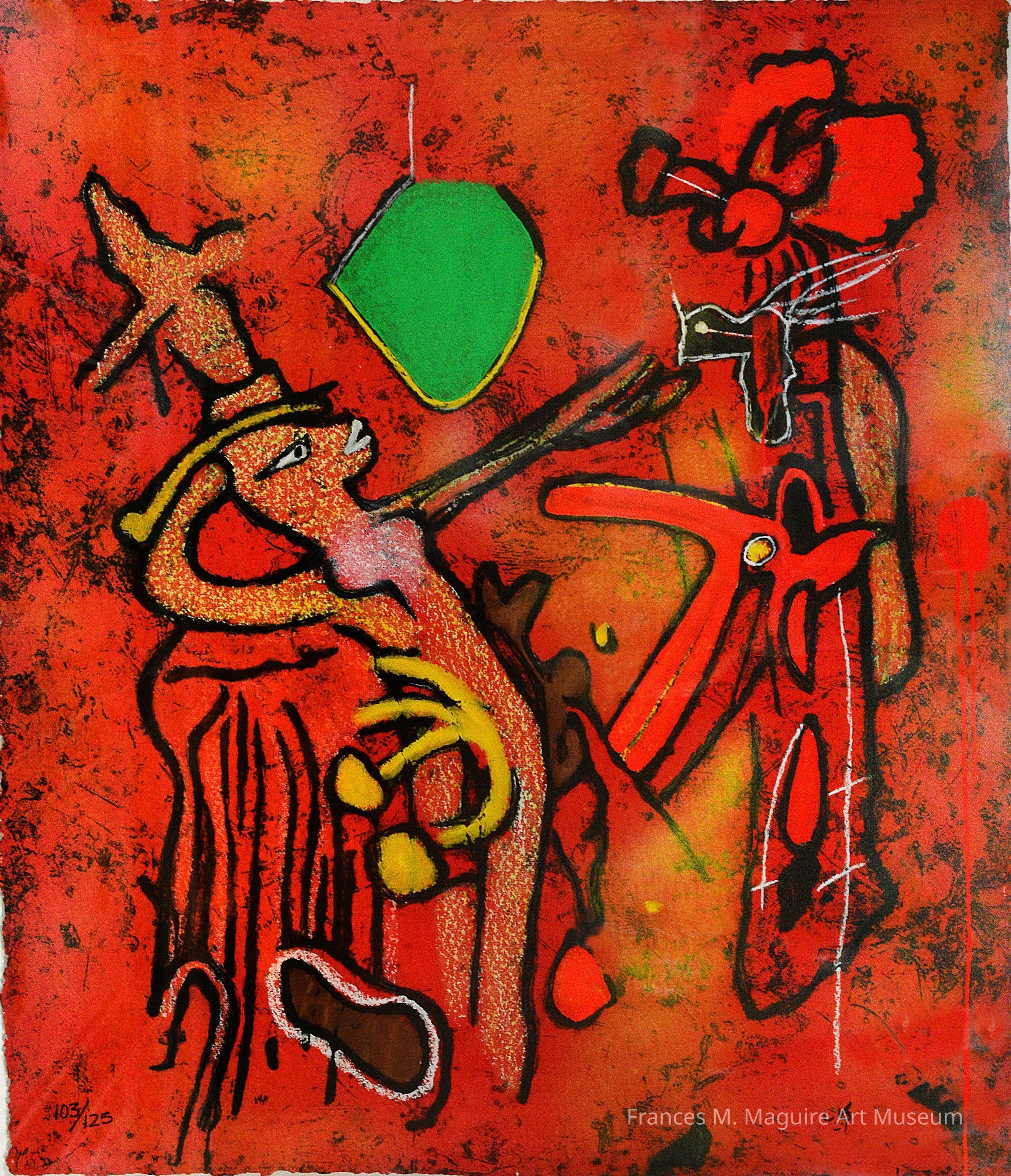 A member of the Surrealist movement, Matta produced works that stand out for their social and political undertones and unique blend of abstraction and figuration. This is a very late work by the artist that demonstrates his spiritual mindset in the years before his death, when he turned increasingly to mystical and mythological themes. The word “eld” is an archaic English word for “old,” perhaps referencing this advanced stage in his life and career, though his meaning remains characteristically ambiguous. Matta produced the brilliant, saturated colors, varied textures, and softened forms by using a printmaking technique called carborundum etching.