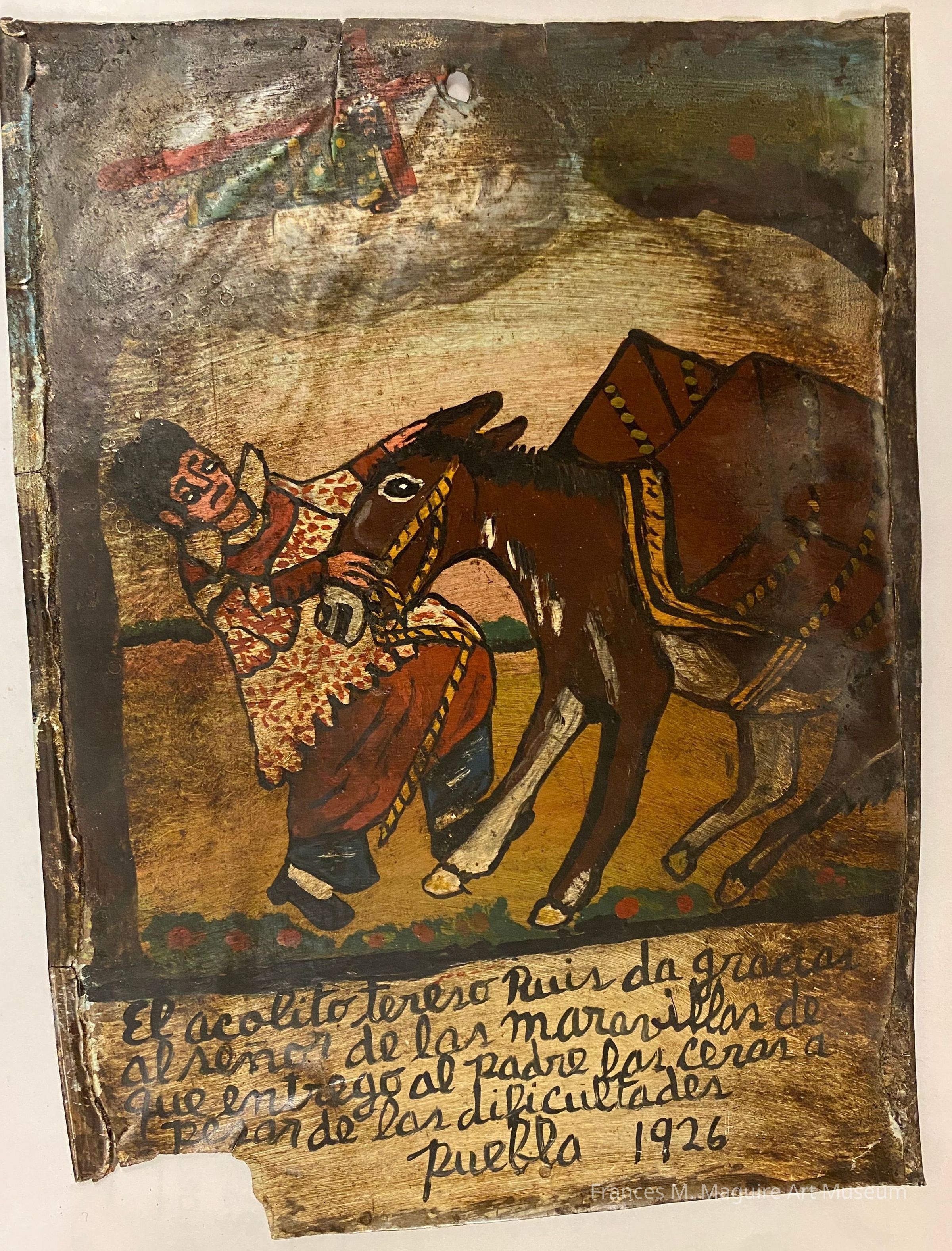 A 1926 Mexican ex-voto in which altar server Tereso Ruis gives thanks to the Lord of Wonders (Señor de las Maravillas or Jesus) for delivering the waxes to the priest despite the difficulties.Made/Created