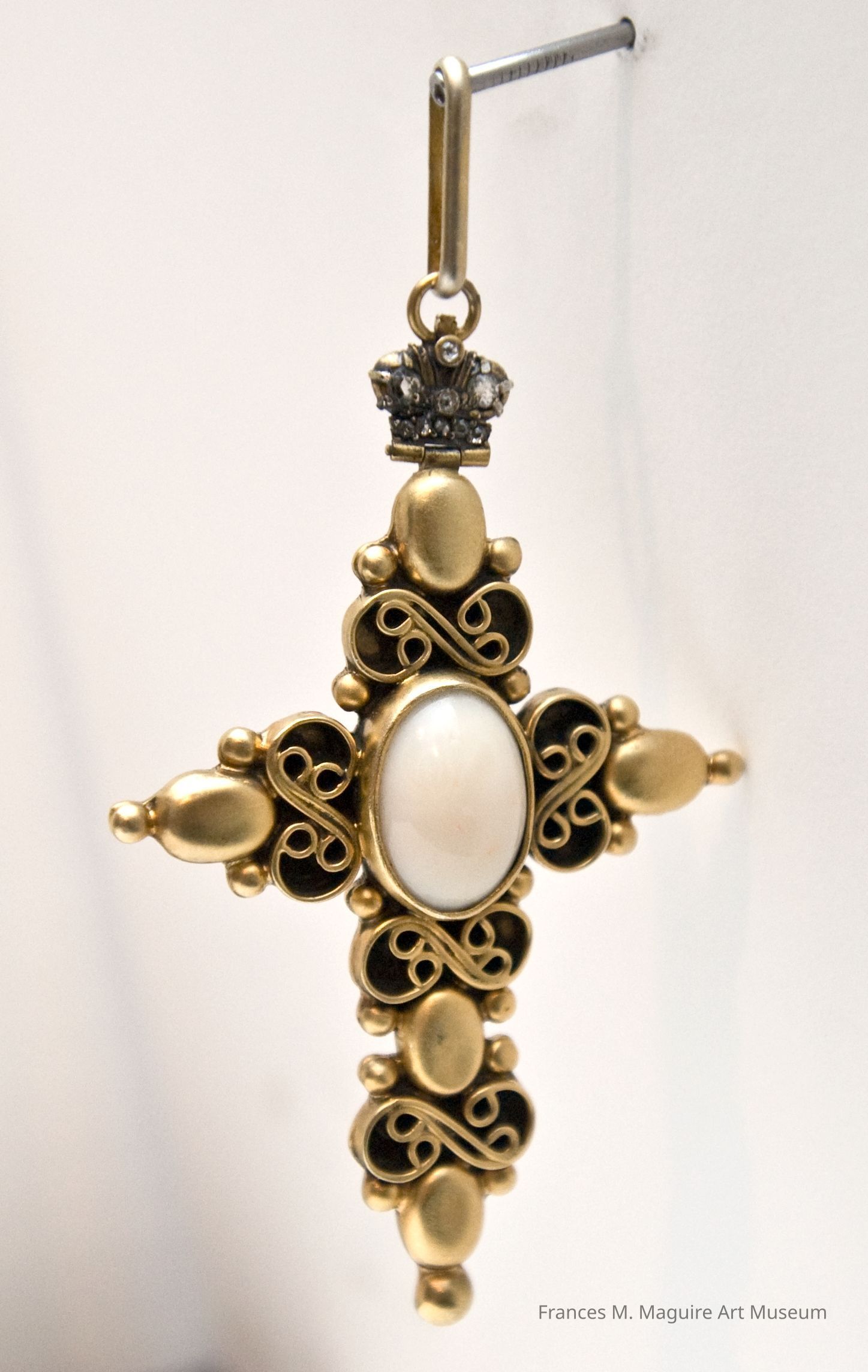 Faberge gold cross with large oval pearl in the center, intricate gold work, and a Russian crown of diamonds at the topMade/Created