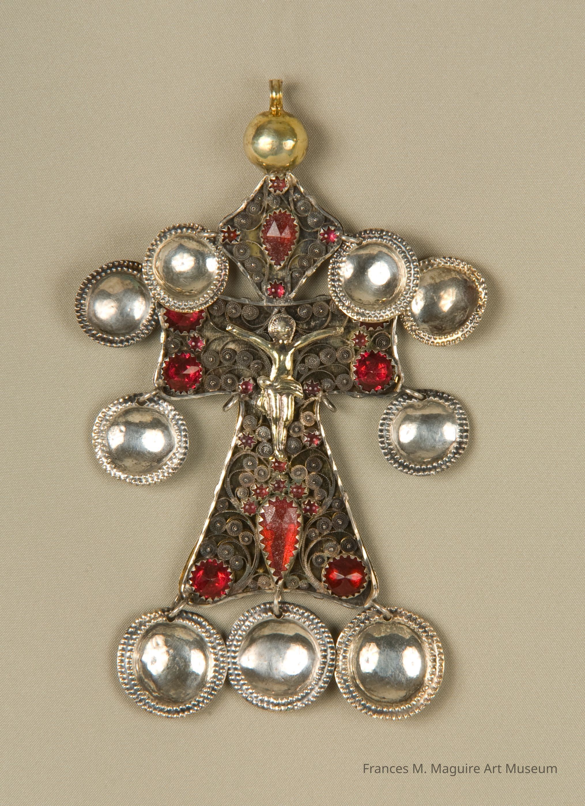 Russian silver pectoral cross with filigree and red paste gemsMade/Created