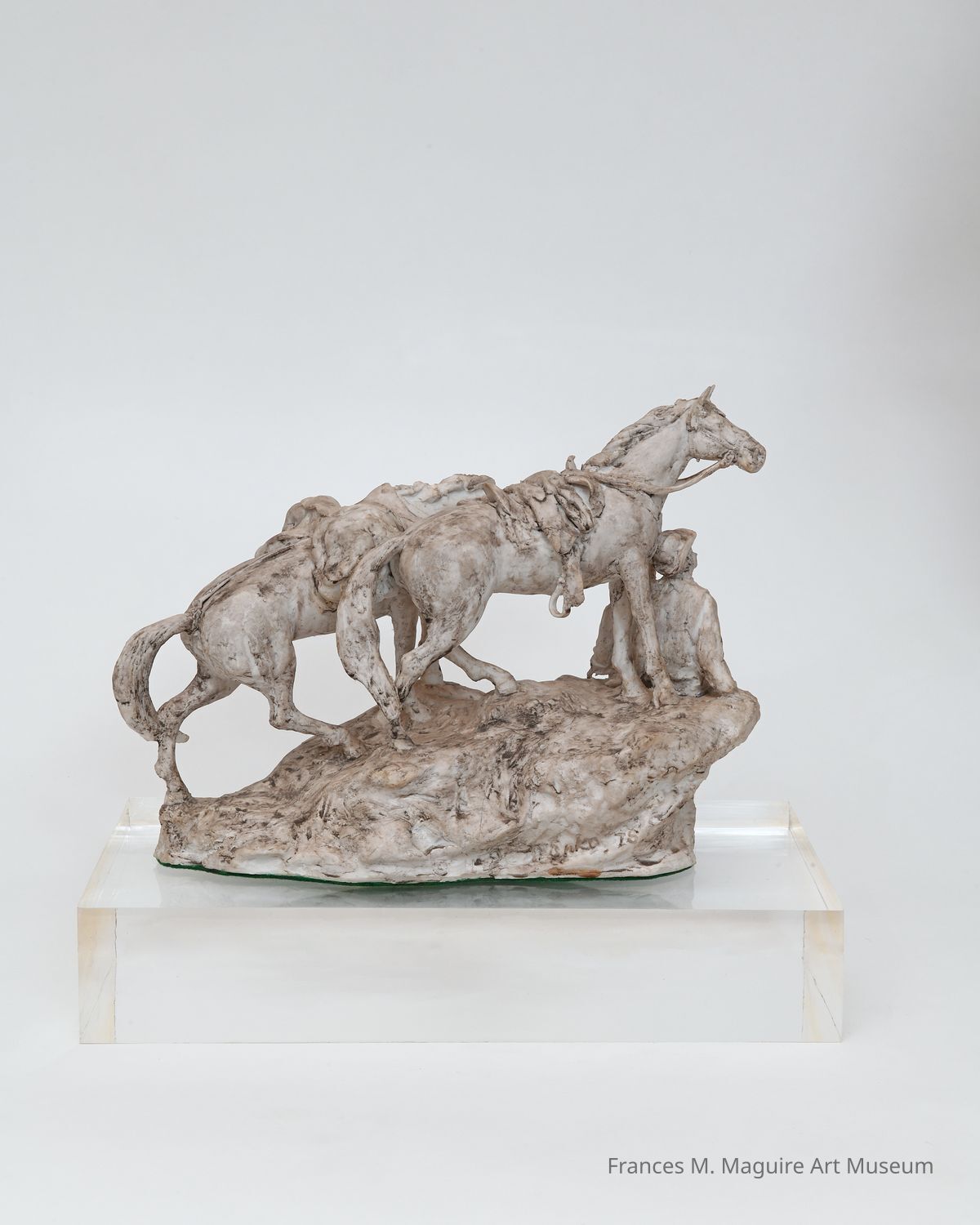 Porcelain sculpture of a father, son, and two horses.
