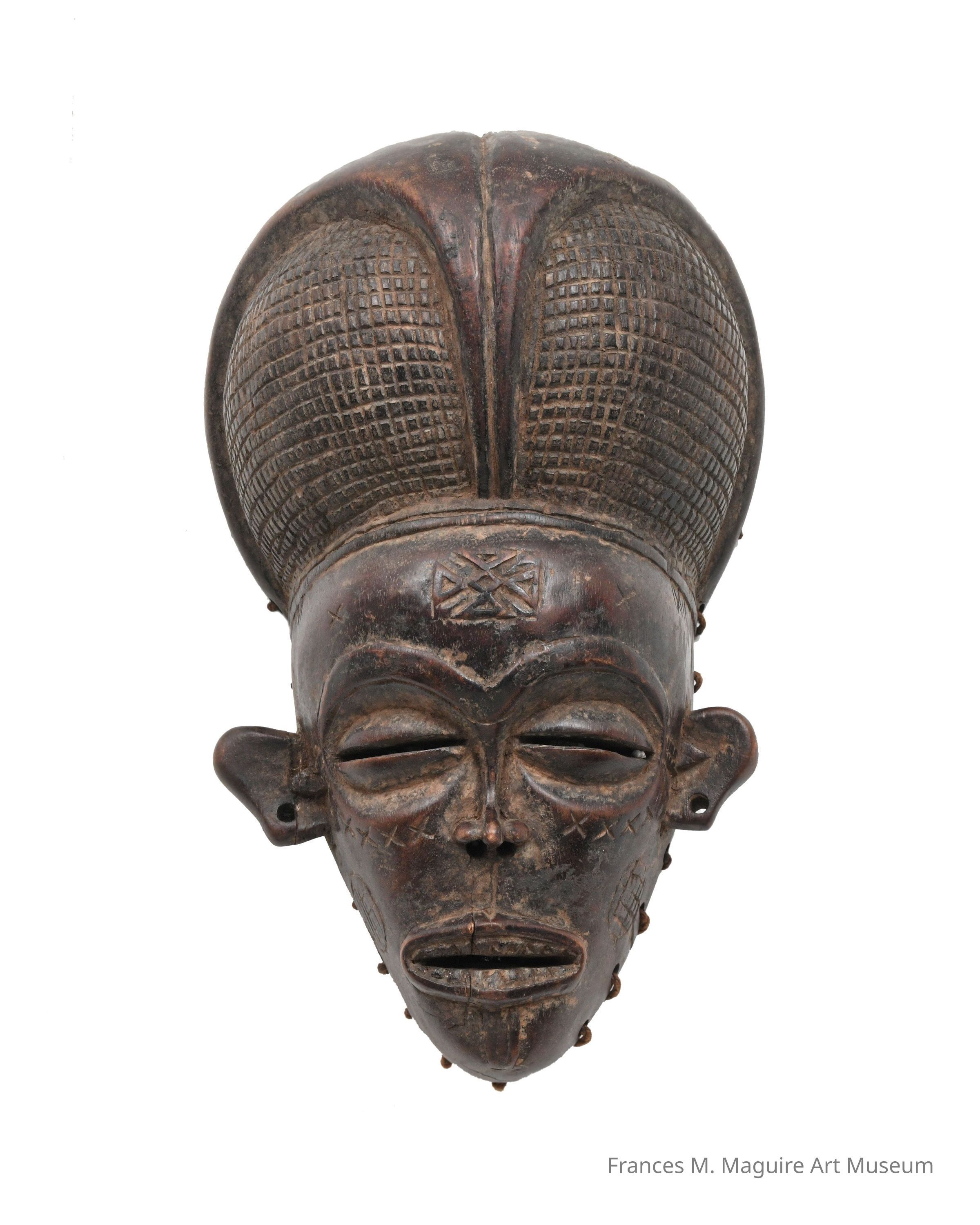 “Pwo” is a classic mask genre that honors founding female ancestors of the Chokwe people. Pwo are associated with Chokwe initiations for boys 8-12 years old. For these ceremonies, a male dancer dons the Pwo mask, dresses in a costume of braided fiber, and emulates the slow, precise movements of Chokwe women. The masks act as intermediaries for the initiates, and the performances help dissolve the bonds of intimacy between the boys and their mothers. The tear motif carved under the eyes of the mask alludes to the sorrowful separation the performances represent for Chokwe mothers. The dikenga–the prominent four-point motif on the forehead–is a cosmogram representing the cycle of life.