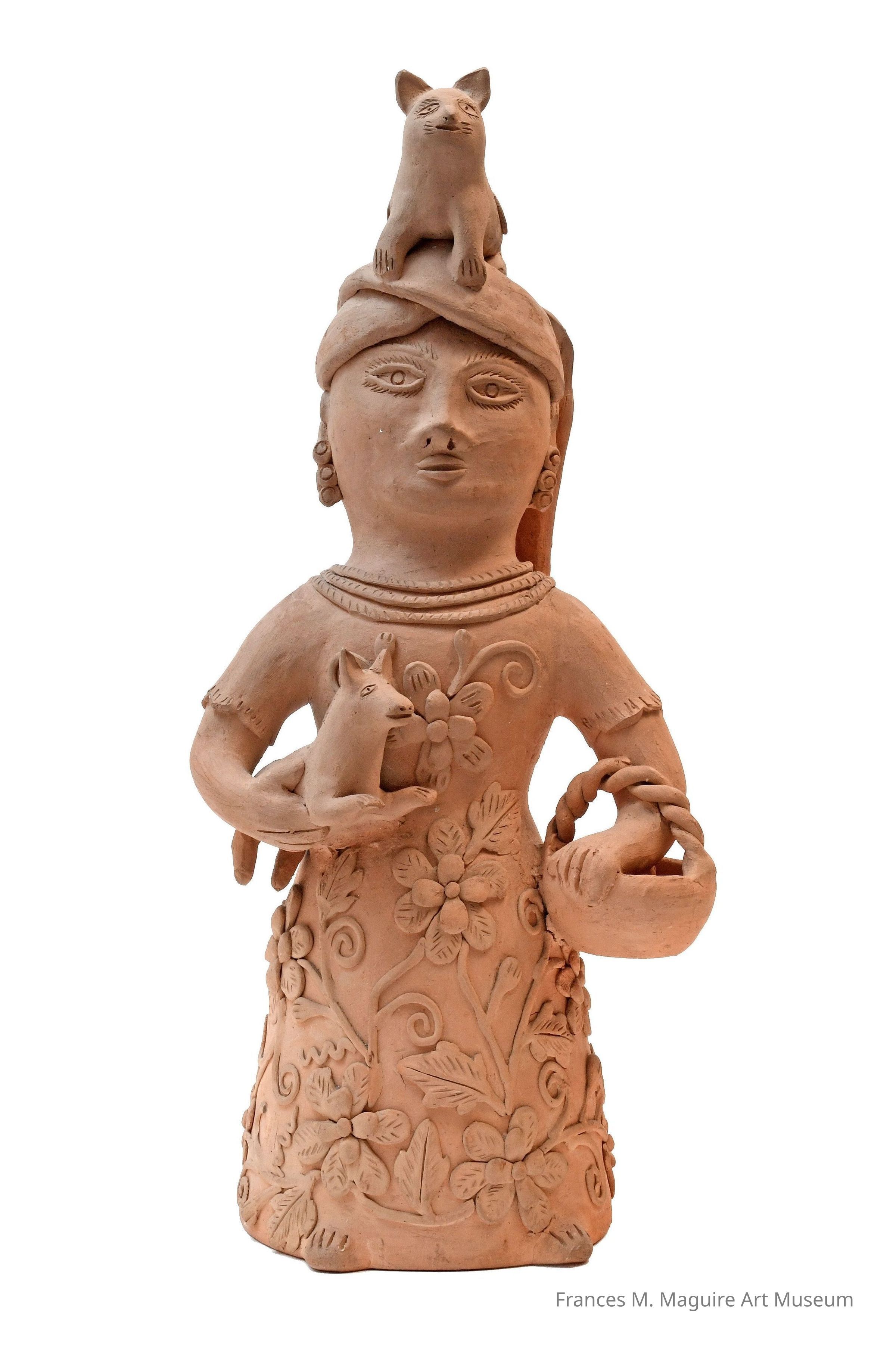 20th-c. Mexican clay sculpture of a woman with a cat on her head and holding a dog in one arm and basket with a bird in the other.Dimensions
