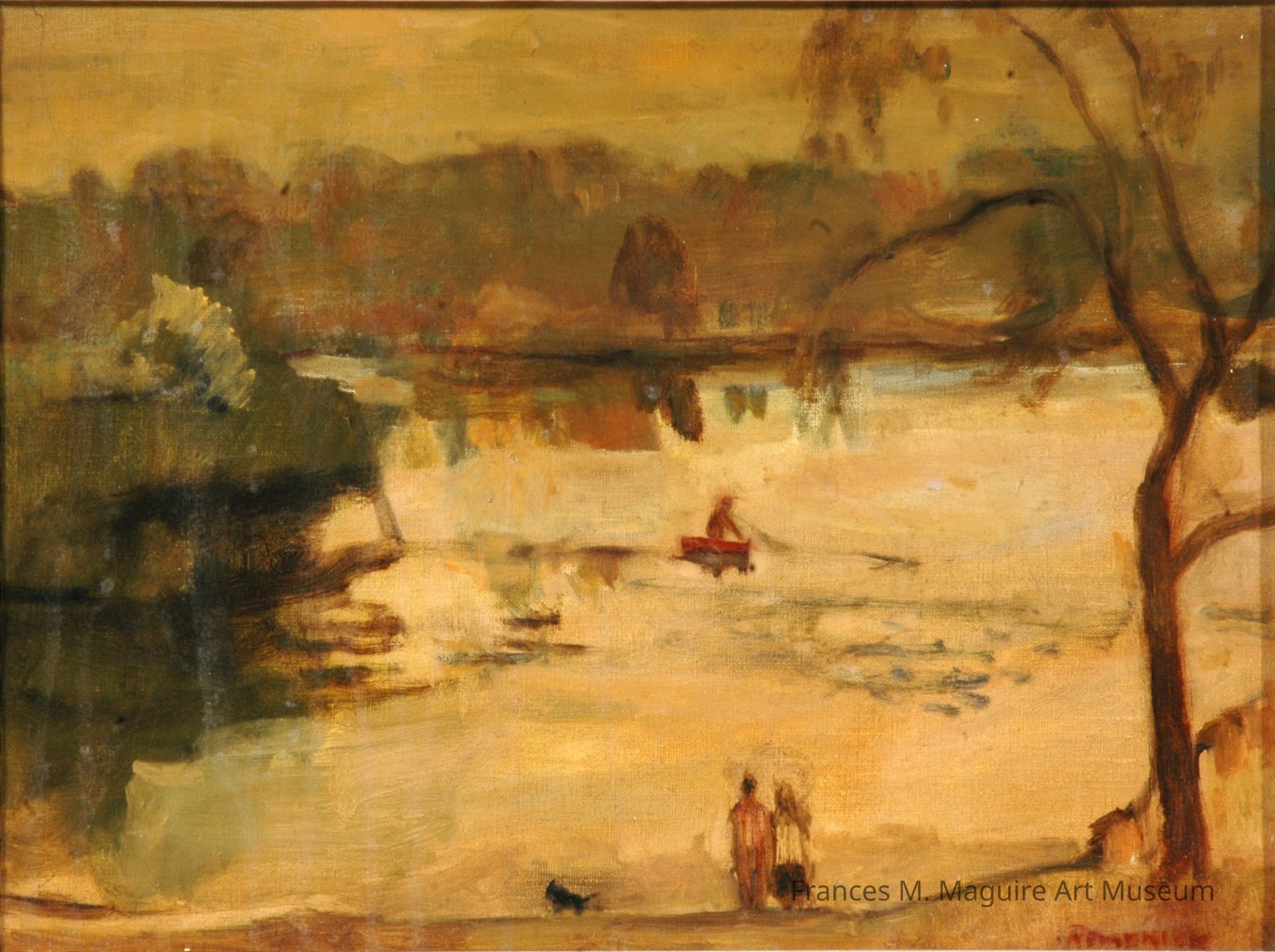 20th-c. landscape painting with a person in a boat fishing in a small body of water and two figures and a dog watching from the shore.Made/Created