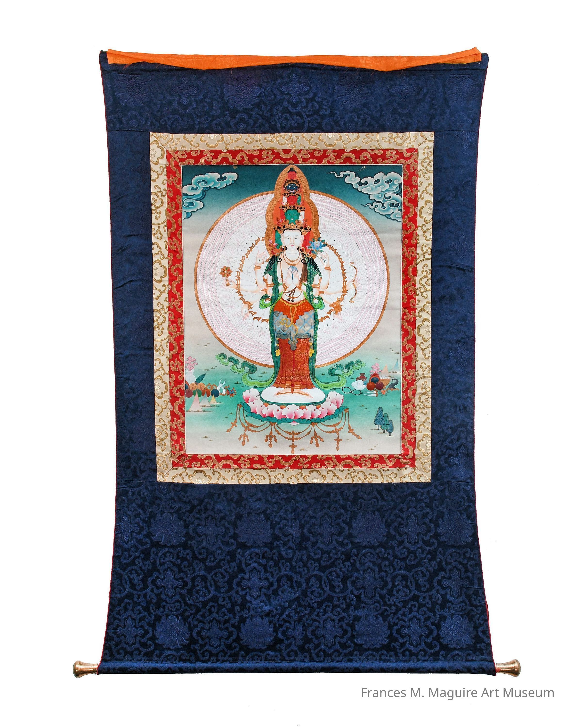 20th-c. Tibetan Buddhist Thangka depicting Avalokiteshvara (Chenrezig) with four arms. Consecrated.Interpretative Labels