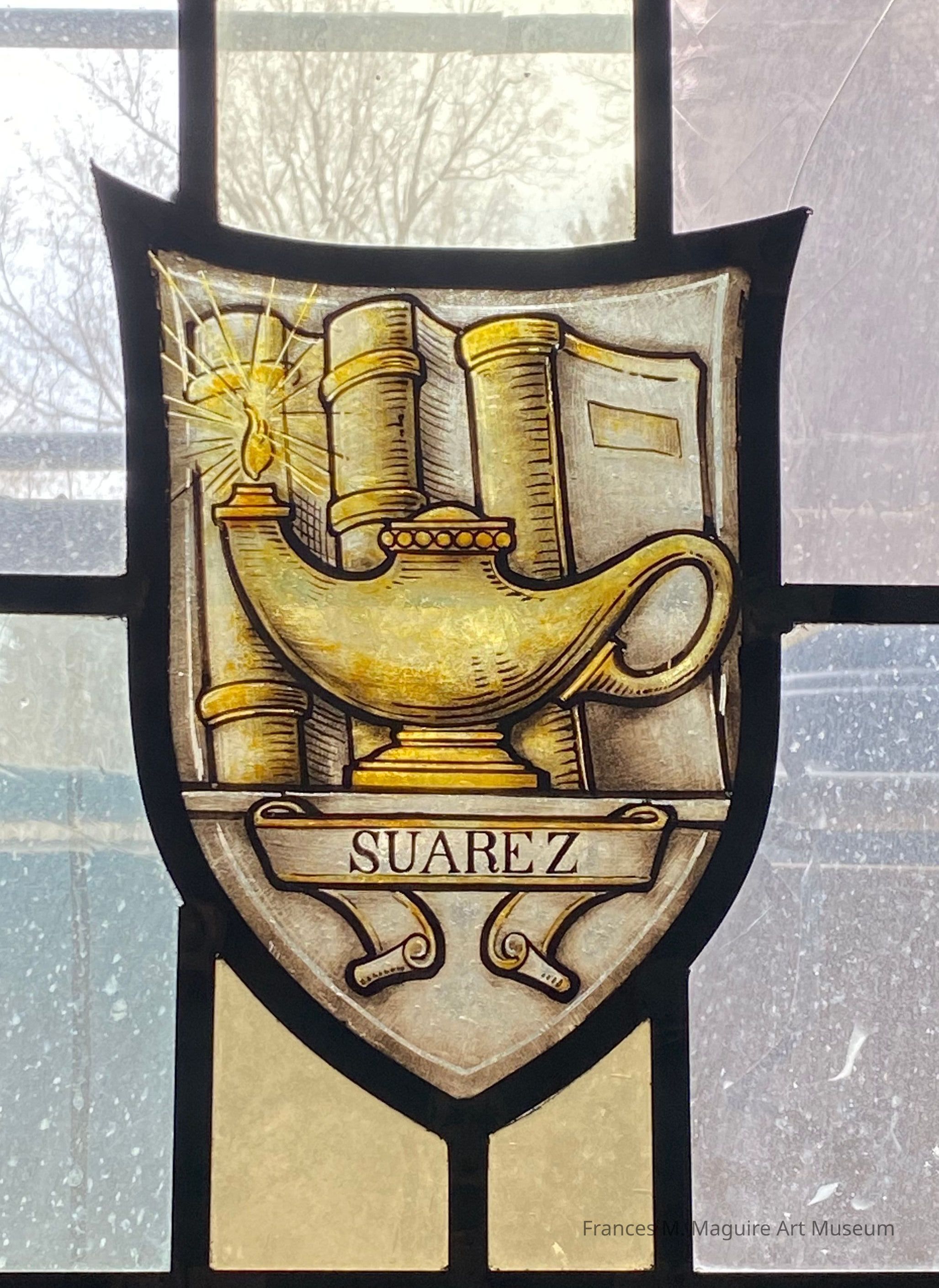 Stained-glass shield commemorating Francisco Suarez (1548-1617), a Spanish Jesuit philosopher and theologian.Made/Created