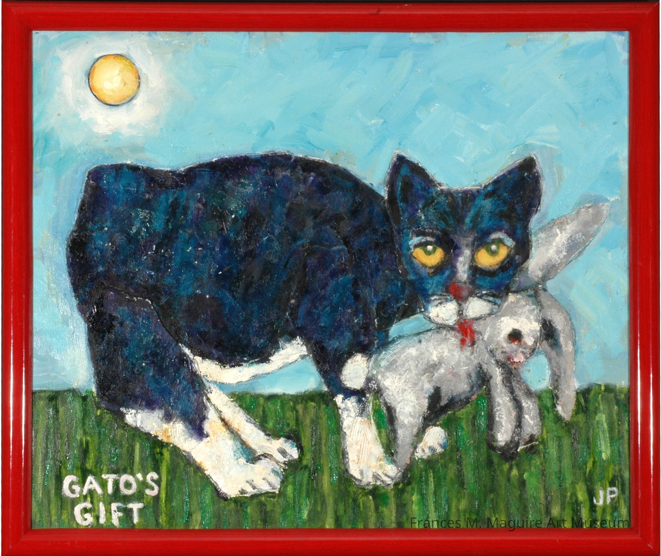 Mixed media work depicting a cat holding a rabbit in its mouth.Made/Created